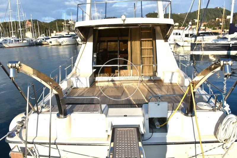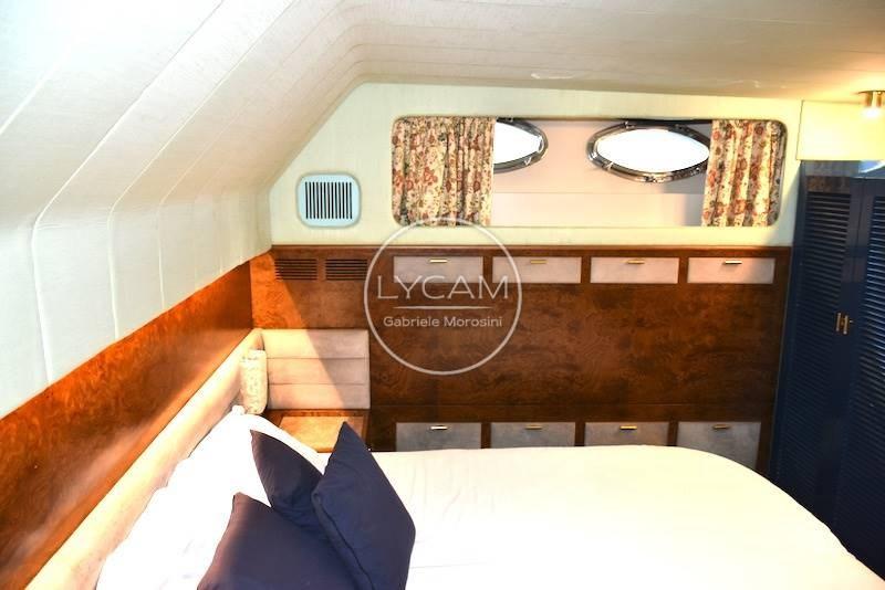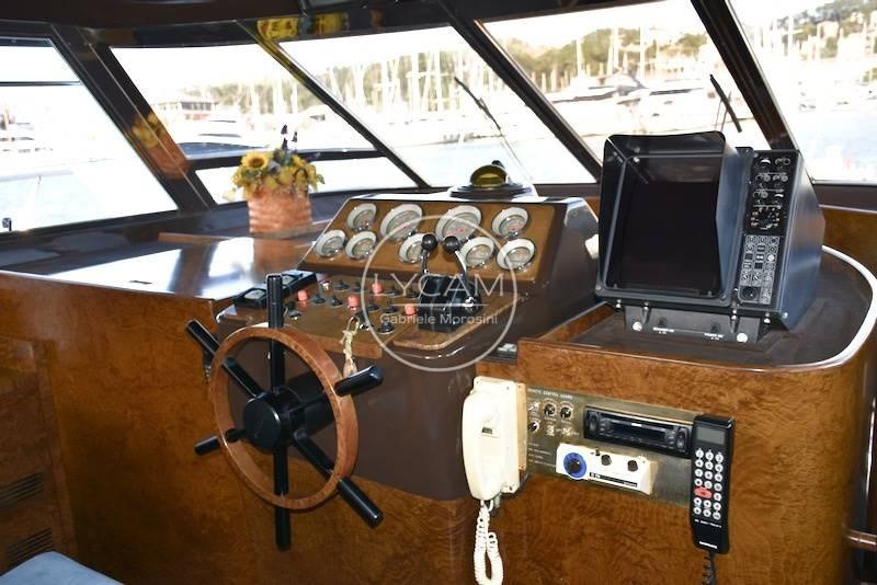 Double helm station - fly and interior - with original engine instrumentation, rudder angle, 2 compasses, odometer, Furuno radar, VHF, radio with saloon speakers, cockpit and flybridge, radio in each room, night navigation beacon with double control, TV antenna.