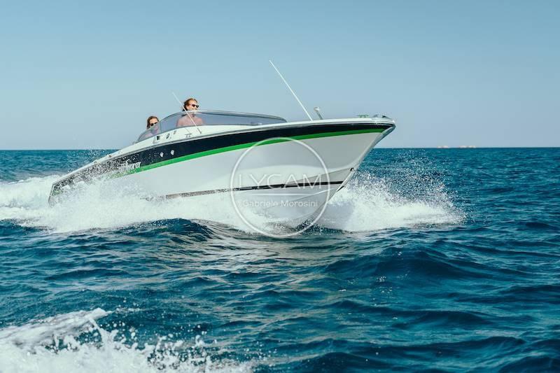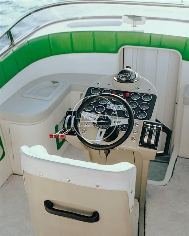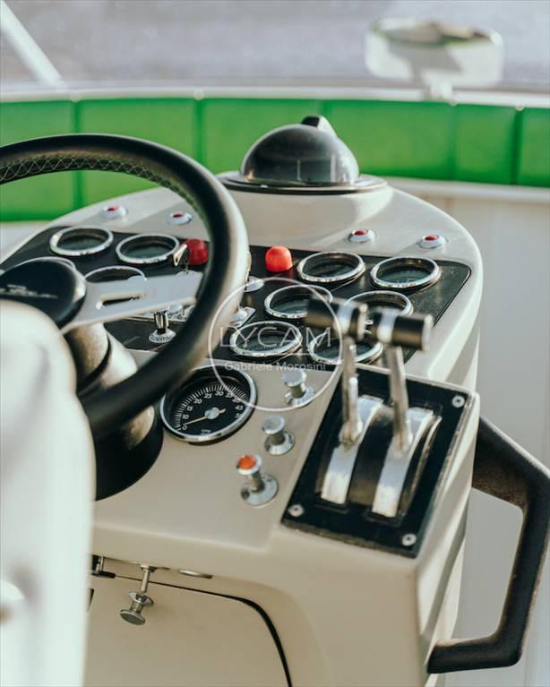 The cockpit of the motorboat is of the classic type, with a large aft sundeck and a central and enveloping helm seat, in the bow a cabin with two berths, all finished with great attention to detail.