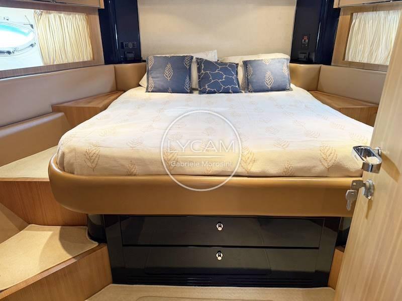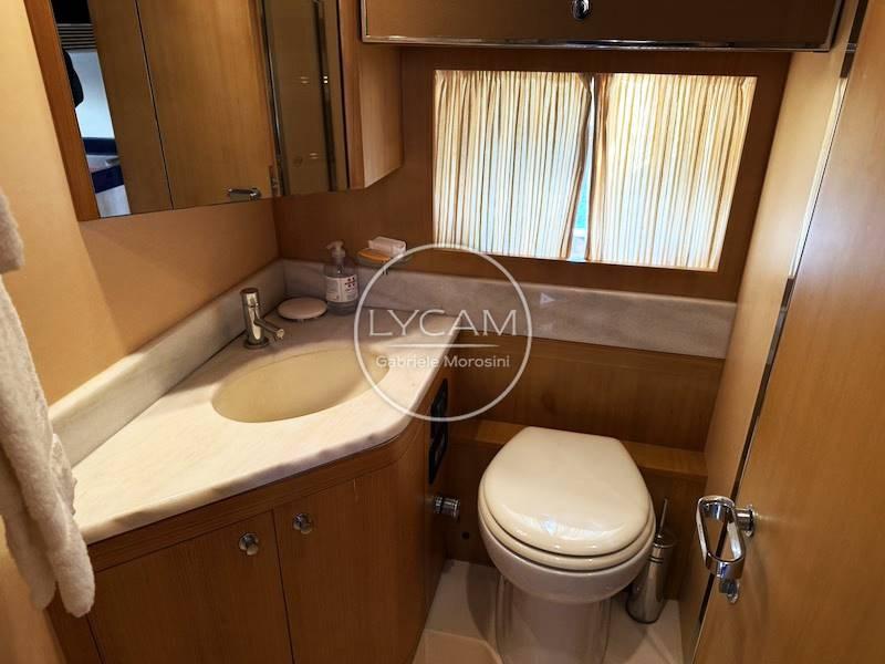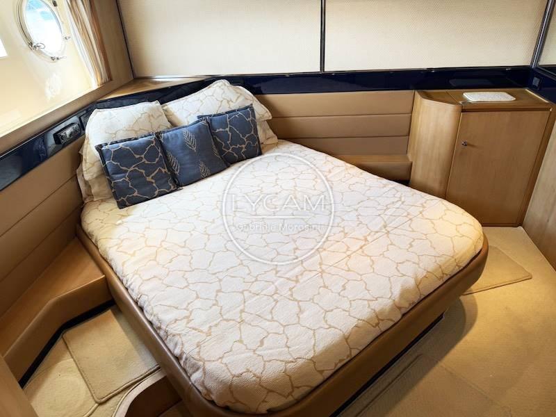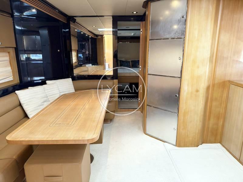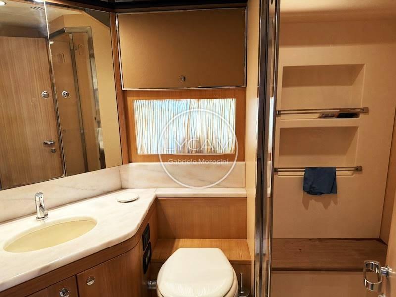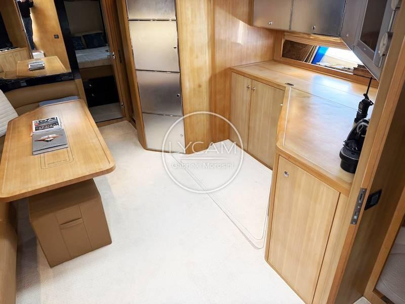 Through the aft platform you enter the voluminous cockpit with double sundeck protected by elegant mahogany handrails. The L-shaped external dinette is positioned along the starboard side while on the opposite side a cabinet hides the descent to the crew cabin. Proceeding towards the bow there is the bar cabinet (sink + burner plate) and the comfortable wheelhouse with seat for pilot and passengers. In the bow area of the deck there is a spacious sundeck embellished with refined mahogany handrails. Access to the lower deck is located to the left of the helm station and, once you get off, you are immediately welcomed into a bright and welcoming dinette on the left with a galley on the opposite side. In the bow the guest cabin with double bed and en-suite bathroom; while the owner's cabin with adjoining master bathroom has been positioned aft.