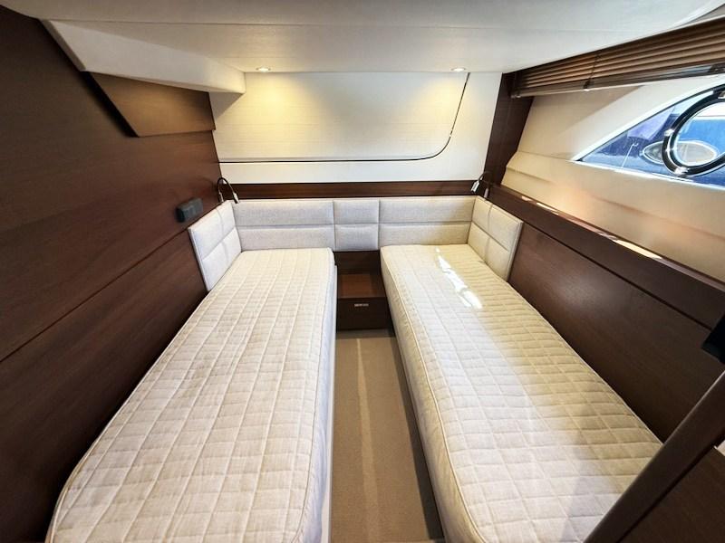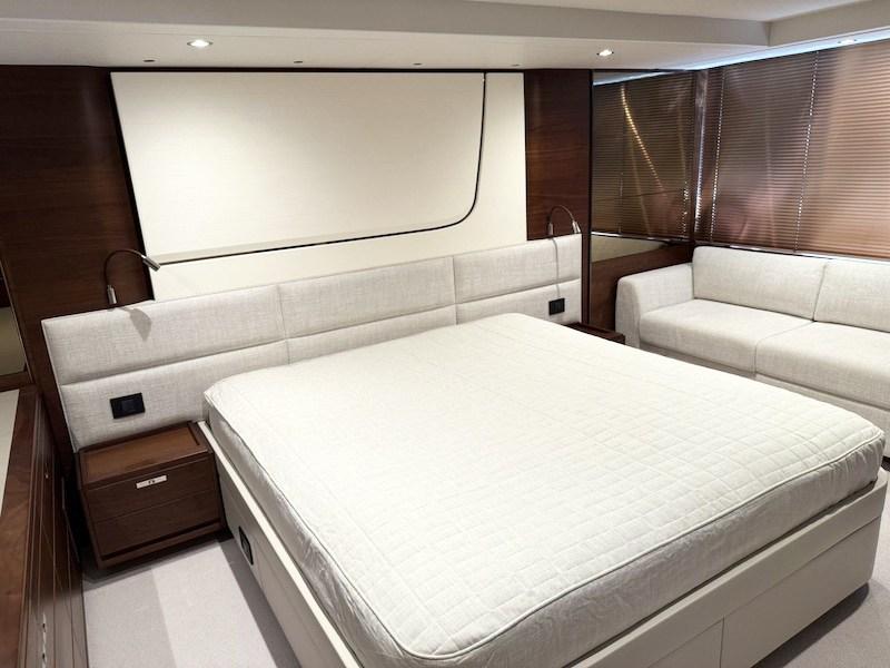 The owner's cabin has private access from the main dinette area and is equipped with a panoramic sofa on the port side and an en-suite bathroom.