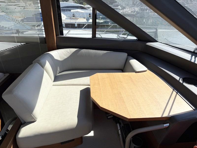 The flybridge has a functional set-up with a living area, table, seats and helm station protected by the soft top.