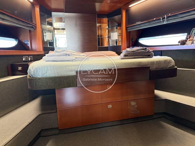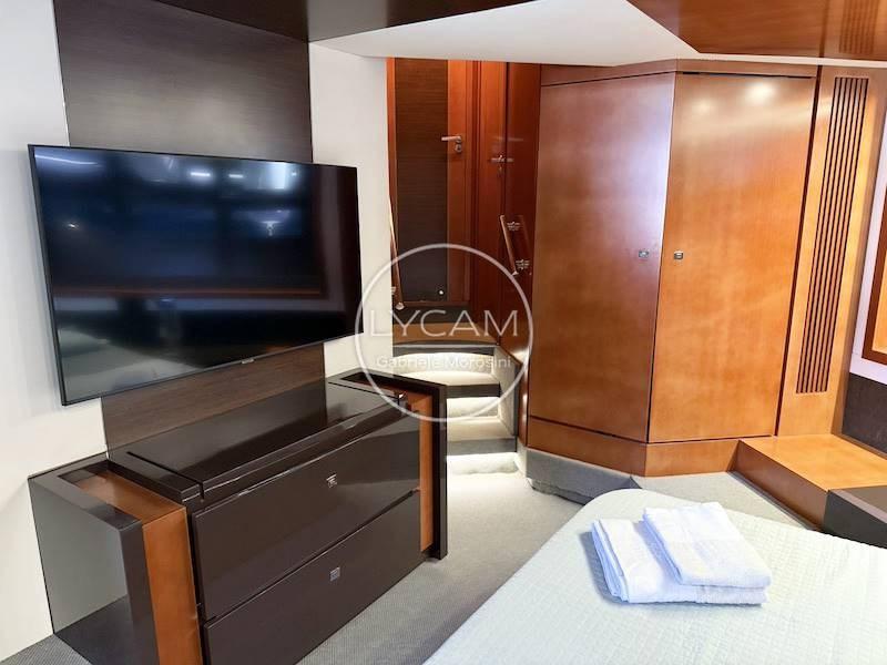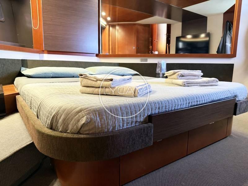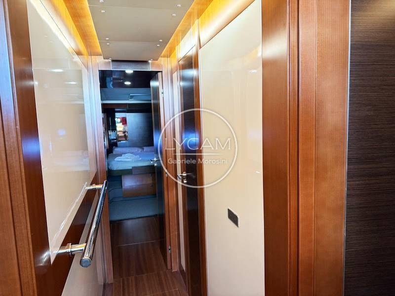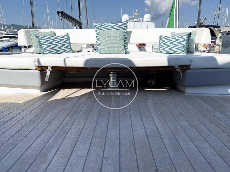 Navigation lights; Anchor light; Underwater lights; Still; Chain; Wipers; Mermaid; Swim ladder; Cockpit shower; Teak cockpit; Hydraulic walkway; Flagpole; Teak platform; Cockpit fridge; Isotherm cockpit ice maker; Cockpit kitchen sink; Cockpit cushions; Cockpit table; Bow sundeck cushions; Electric winch; Mooring bollards; Stern mooring winch; Cockpit speakers; Aft awning; Mase generator 17 Kw; Batteries; Battery switch; Parallel; 220V socket; Air conditioning; Flaps; Bow Thruster; Tender with 25 HP outboard engine; RINA 05/25; Internal fridge; Oven; Miele dishwashers; Induction fires; Freezer; TV; Grey water tank; Black water tank; LG Washing Machine