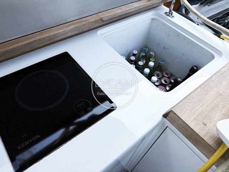 Navigation lights; Navigation lights; Mooring bollards; Electric windlass; Still; Chain; Bow thruster; Cockpit awning; Teak beach; Swim ladder; Teak cockpit; Teak passaside; Cockpit table; aft sundeck cushions; External sink; Frigo (49lt); Icebox; Induction plate; Electric toilet; Service batteries and engines; Battery disconnect; Charger; 220V socket; Parallel; Flagpole; Cockpit speakers; Cockpit shower; Boiler; Boat Hook