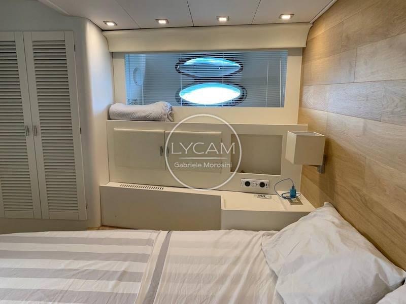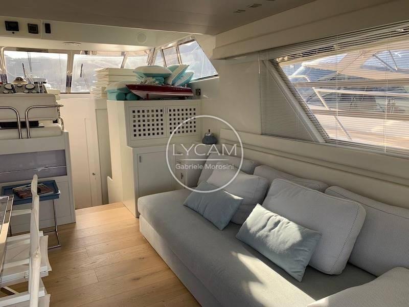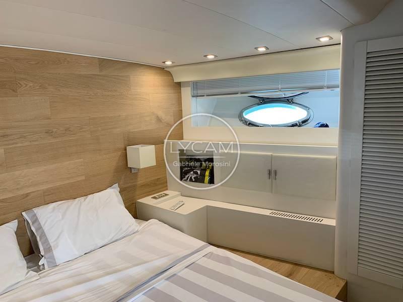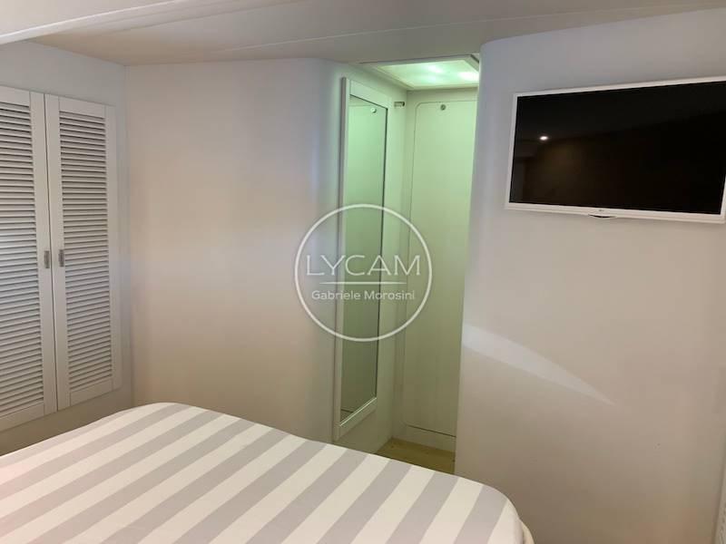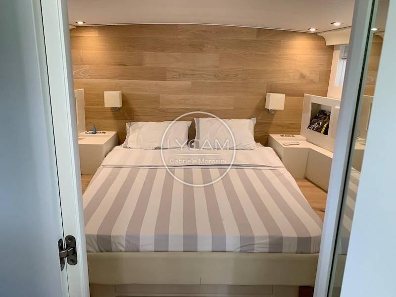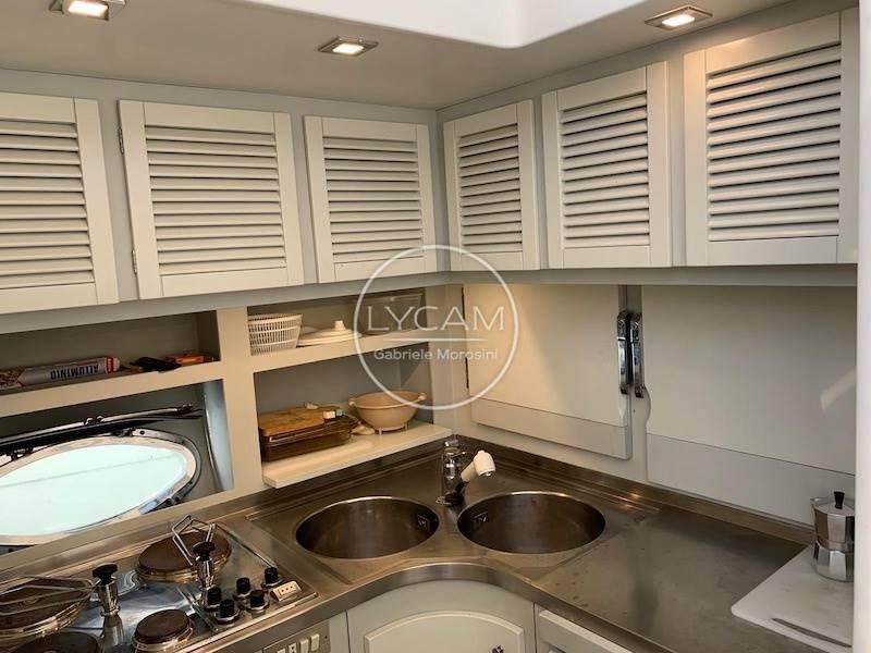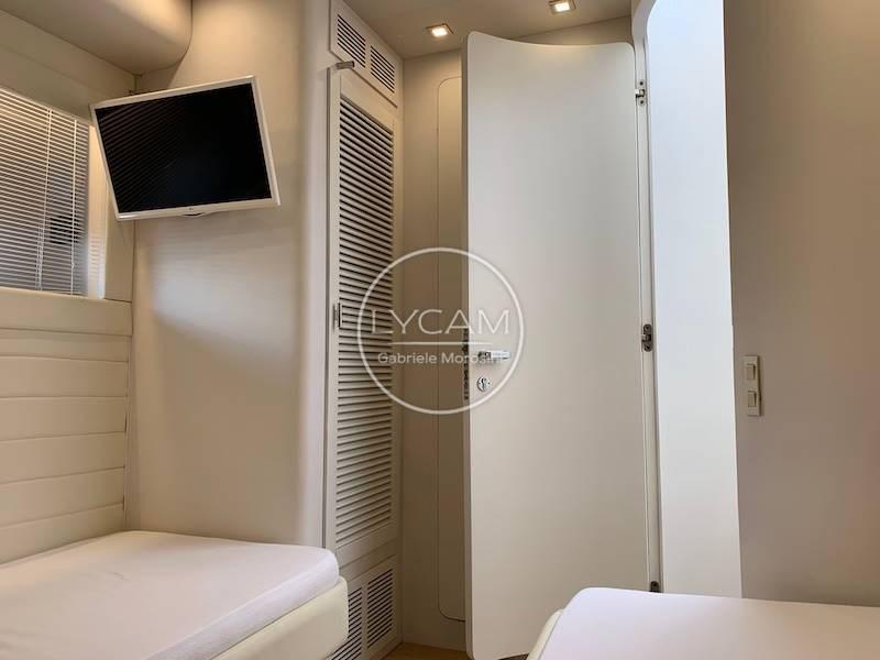 The interiors house below deck the galley on the starboard side and the corridor that disengages a bathroom, a cabin with flat beds on the port side with en-suite bathroom, a cabin with bunk beds on the starboard side and the double cabin in the bow with its bathroom. Crew cabin with access from the bow deck, while aft with access from the cockpit there is a large room used as a workshop and warehouse.