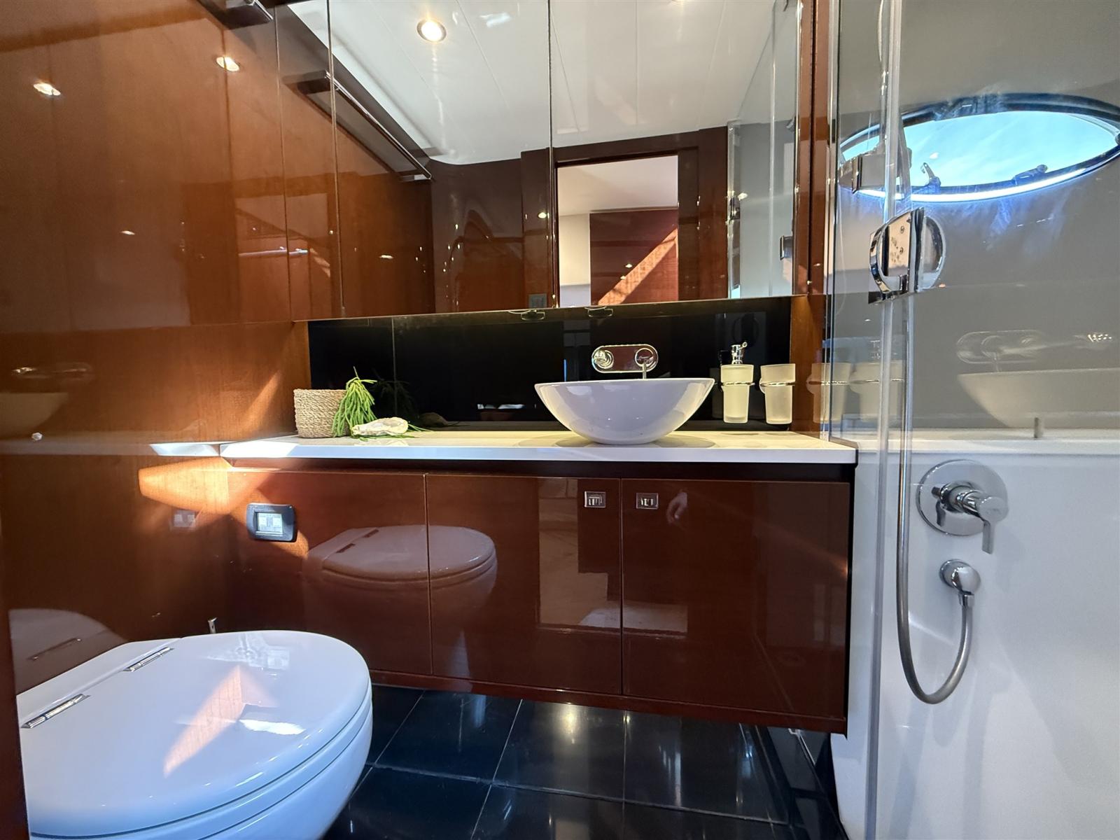Toilet that discharges into the holding tank but also has the possibility to discharge directly overboard via a Y-valve mounted in the discharge pipes. The holding tank has electric overboard discharge as well as spare manual pump and docking controls.