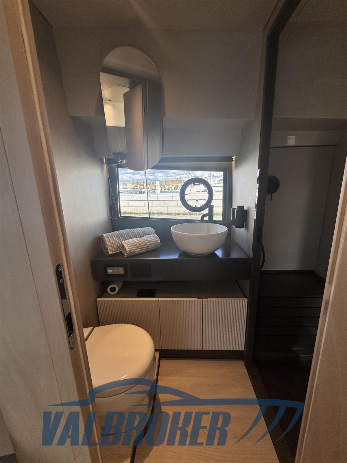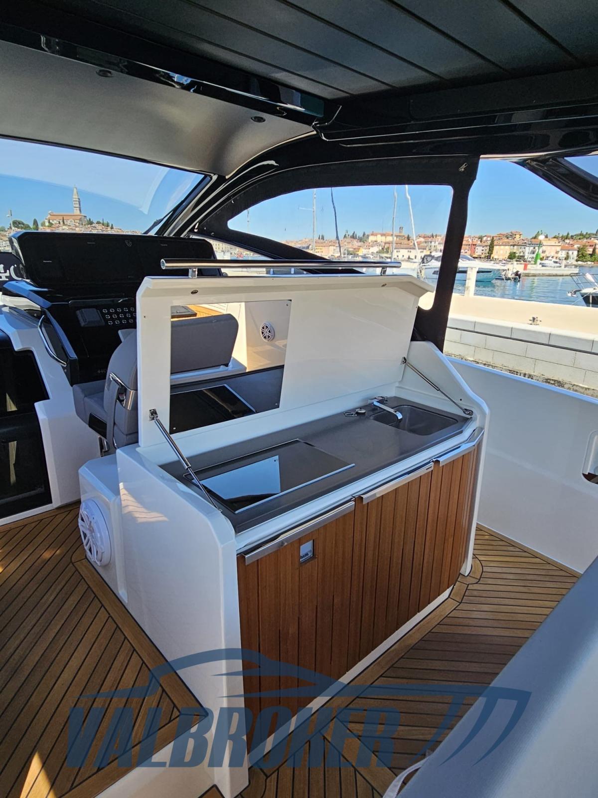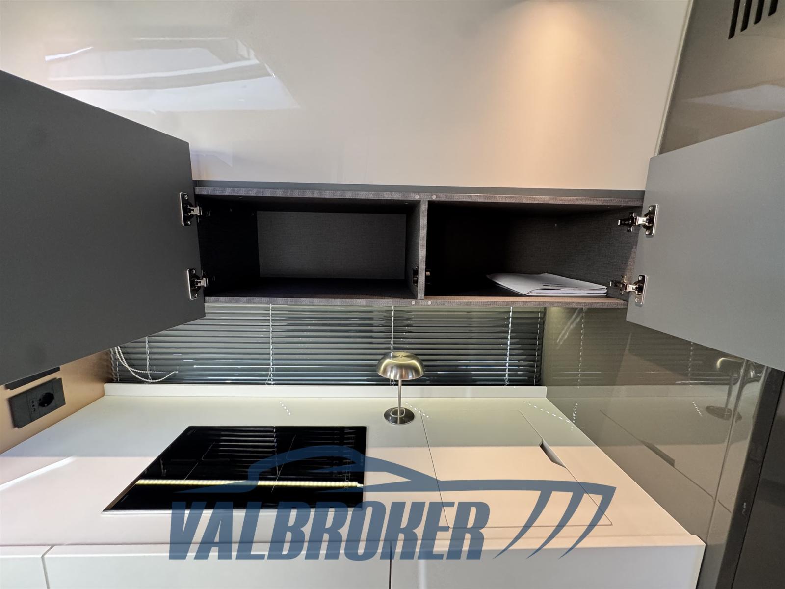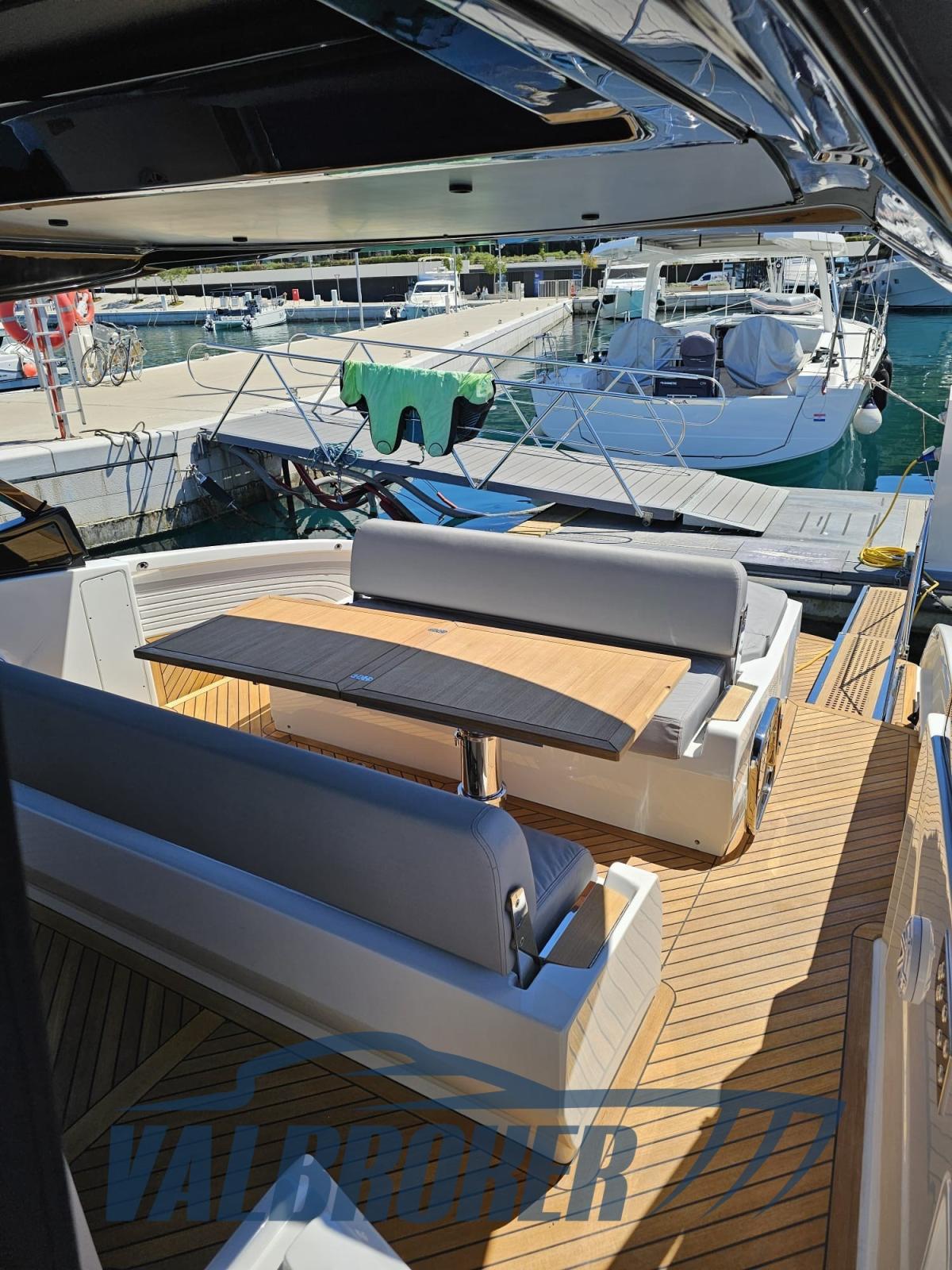 Water pressure pump, 10 Batteries, Teak Side Decks, Deck Shower, Bow Thruster (80 KGF Sleipner), Hard top (tettuccio apribile elettricamente con lamelle), Washbasin in the cockpit, 4 Underwater lights, Gangway (idraulica a scomparsa), Platform (teak, tender-lift 500 kg), Teak Cockpit, Electric Windlass, cockpit table (teak abbattibile), Living Room Foldable Table, Horn.