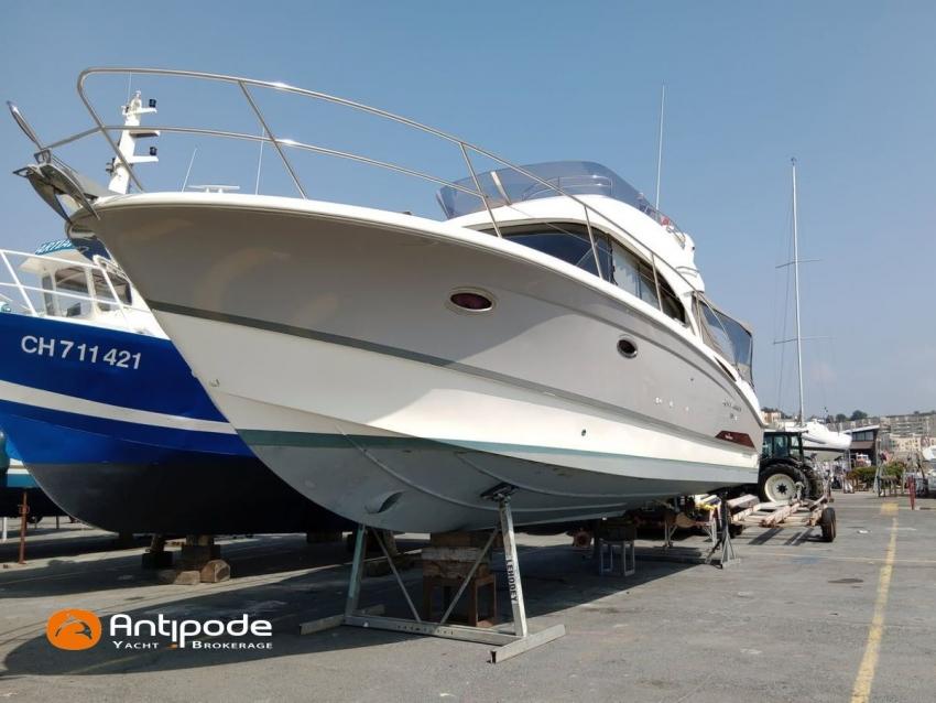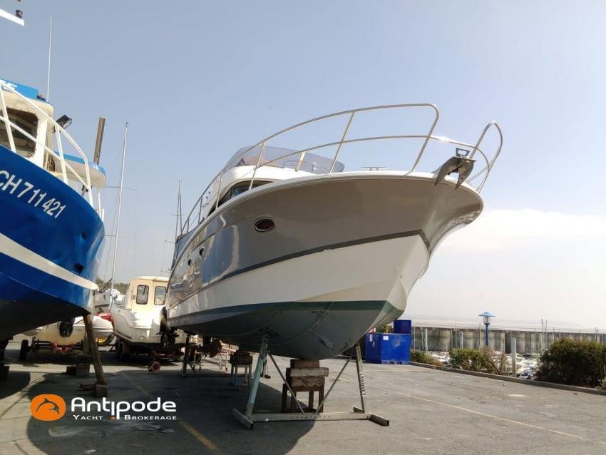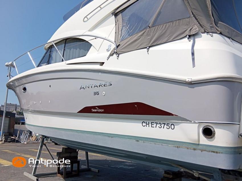 ANTARES 36, 2012, first hand, VOLVO D4, 2x300 hp (740 hrs), Bow thruster, Interior layout version 1 forward cabin, 1 aft cabin, Saloon table convertible in double bed, Teak slatted cockpit floor, Teak bathing platform, Sun bathing deck mastresses, Cockpit+ flybridge electric windlass remote control, Flying bridge sun bathing mastresses, Flying bridge seats covers, Full cockpit enclosure, Windscreen covers., Raymarine in board autopilot, Trim tab - VOLVO QL, GPS and chartplotter (pilot station) - Raymarine C120W, GPS and chartplotter (flybrige) - Raymarine C90W, AIS Transponder CLASS B (emission and reception), Television (saloon), Fridge unit 12 V (front opening door), 2 nd fridge unit 12 V (flybridge), Hot and cold pressurized water, Engine battery - 2025, Service batteries - 2022, Holding tank, Electric toilets - quiet flush, Hot and cold cockpit shower, Liferaft - Bombard 6pl next service 02/2026. For more information or to make an appointment for a visit, contact : François Mouchel 06 62 30 97 30 - francois@antipode-yachts.com
