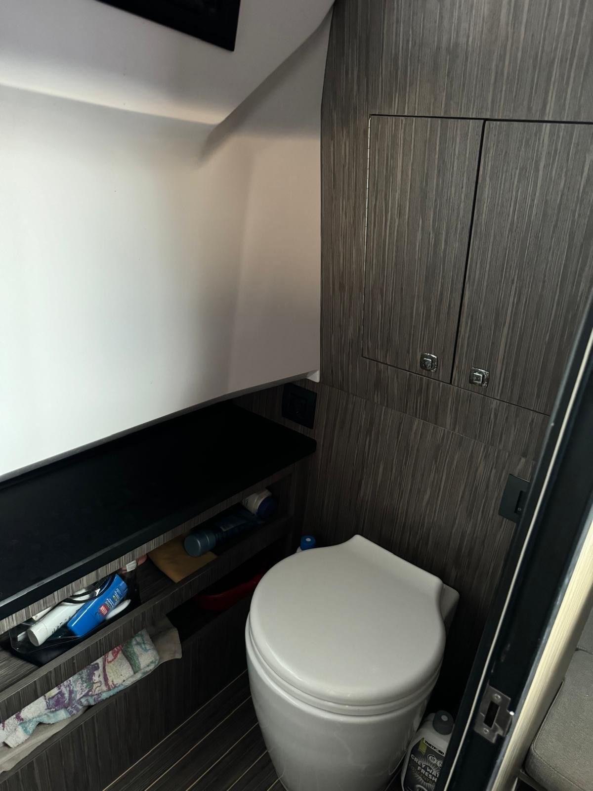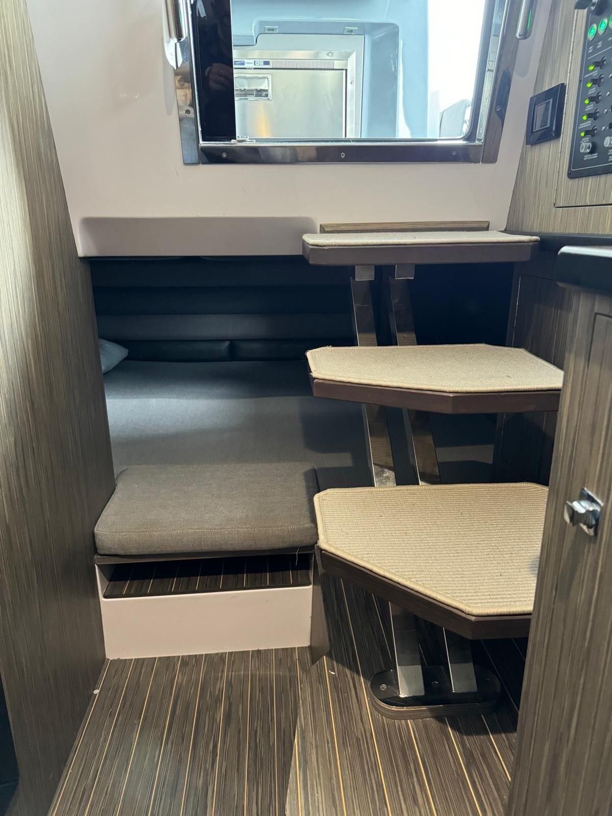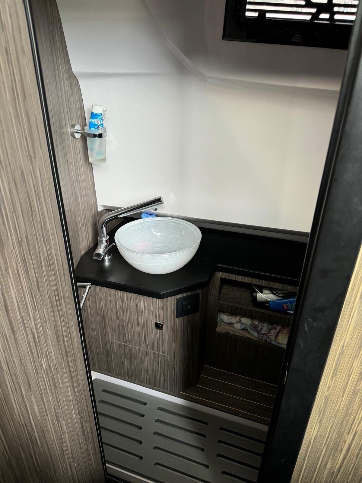 Anchor and chain • LED spotlights • USB sockets • 110/220V power socket • Stern shower • 12V electric inflator • Stainless steel sink with tap • Navigation lights • 2 retractable telescopic ladders • Cup holders and handrails • 50L cabin refrigerator • Electric aft table and sundeck kit • Storage pockets • Electric windlass • Fresh water system with 150L tank • Black water system with 60L tank with drain pump and shore outlet • Stereo system HERTZ with 2 internal + 4 external speakers • Footrest • LED lighting • Electric horn • Electric marine toilet with tank • GPS + echo sounder • VHF • Bow thruster • Chain counter • Boiler • Air conditioning • External fridge • Electric table kit • Awning.