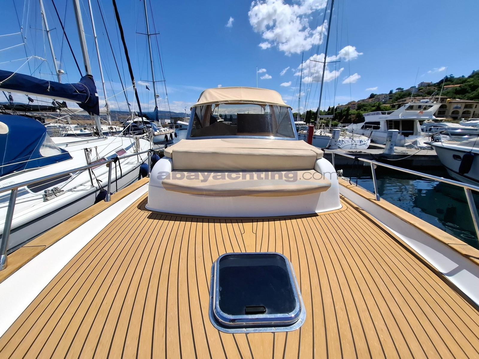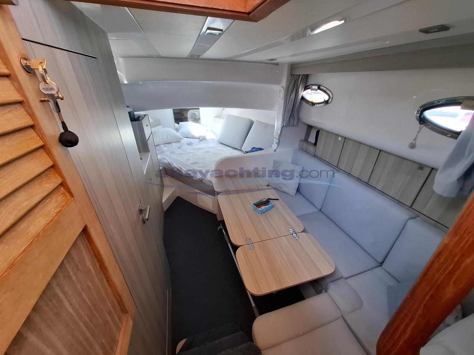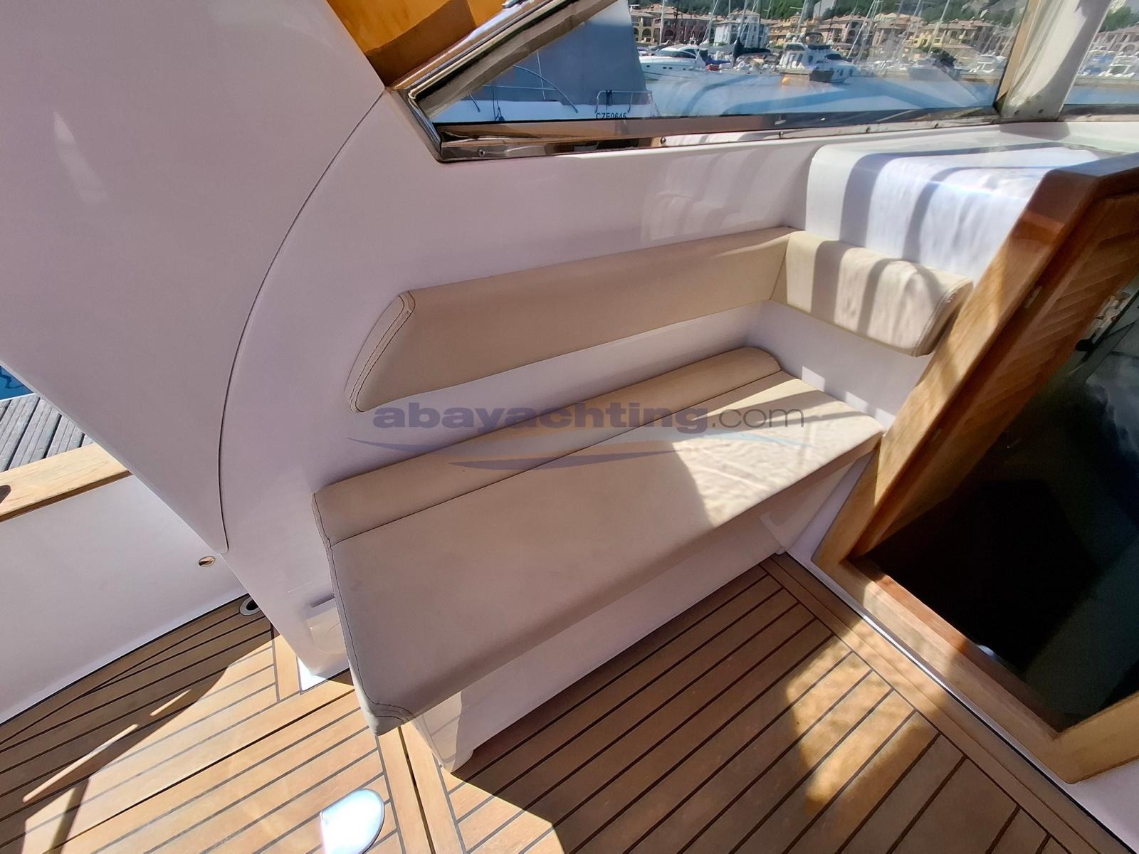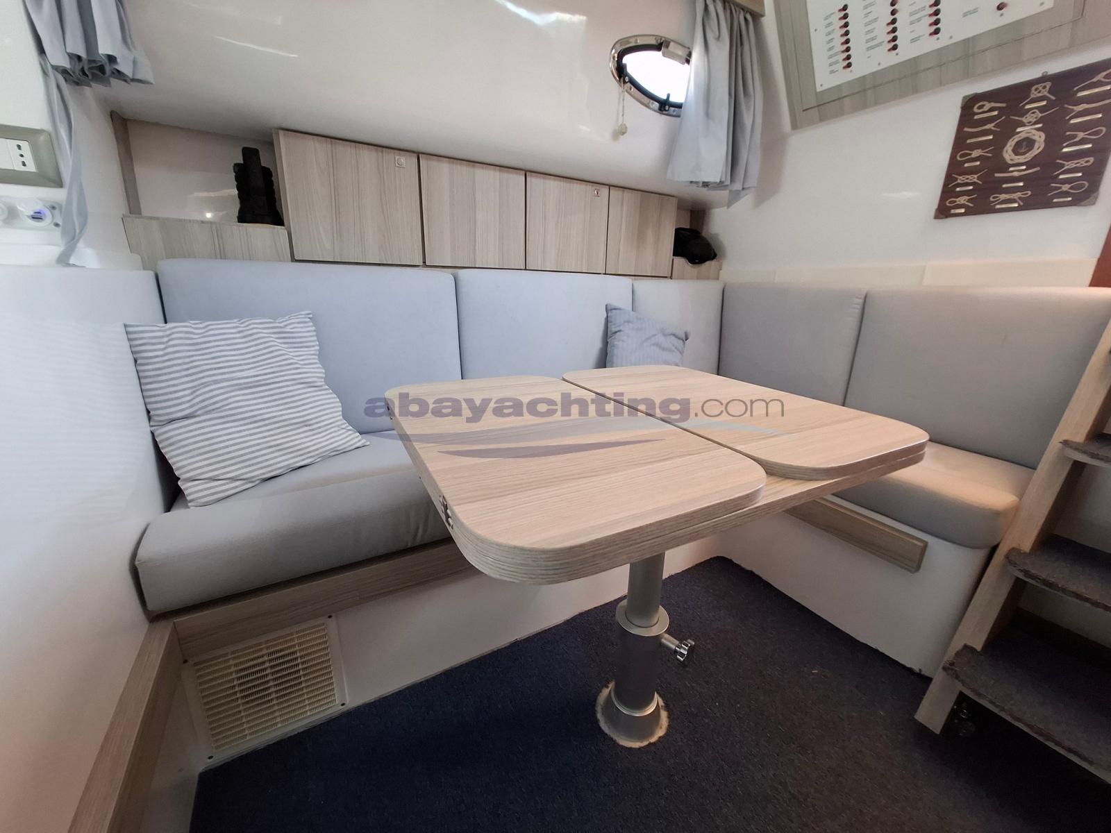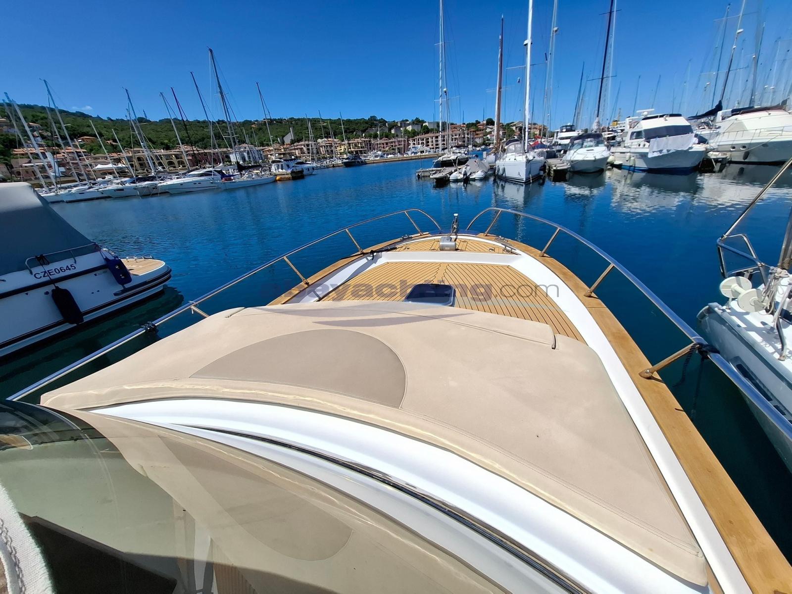 Mimì Libeccio 9.5 Cabin version. An excellent alternative to a good, well-equipped boat: bow thruster, double refrigerator, indoor kitchen, large teak stern platform, bimini top, canopy for complete cockpit closure. Mimì Libeccio 9.5 used. Sleeps 4 and has 1 separate bathroom. Powered by a 250hp Yanmar engine.The information provided in this document is not to be considered contractual.