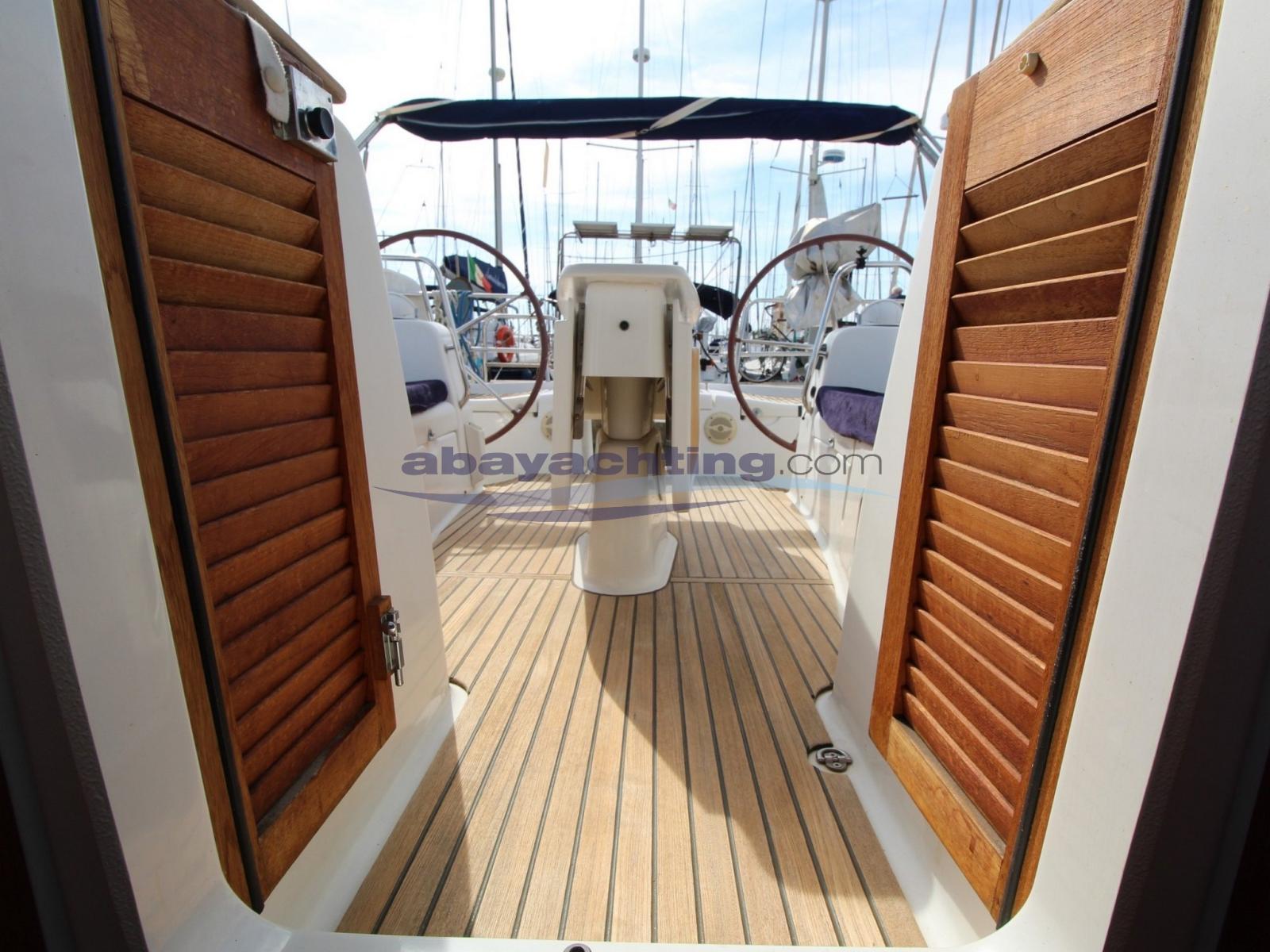 Engine Alarm, Alternator, Anchor (Tipo danforth), Water pressure pump, 5 Batteries, Shore power cable, Special Colour (Blu), Deck Shower (C / F), Twin Steering, Bow Thruster (Max Power), Fenders (6), Gangway (Alluminio + carabottino teak), Automatic Bilge Pump, Manual Bilge Pump, Teak Cockpit, Shorepower connector, Water harbor connector system, Electric Windlass, Strand rigging, swimming ladder, Outboard Engine Support Bracket, cockpit table (Teak), 4 Winch (Harken), Windex.