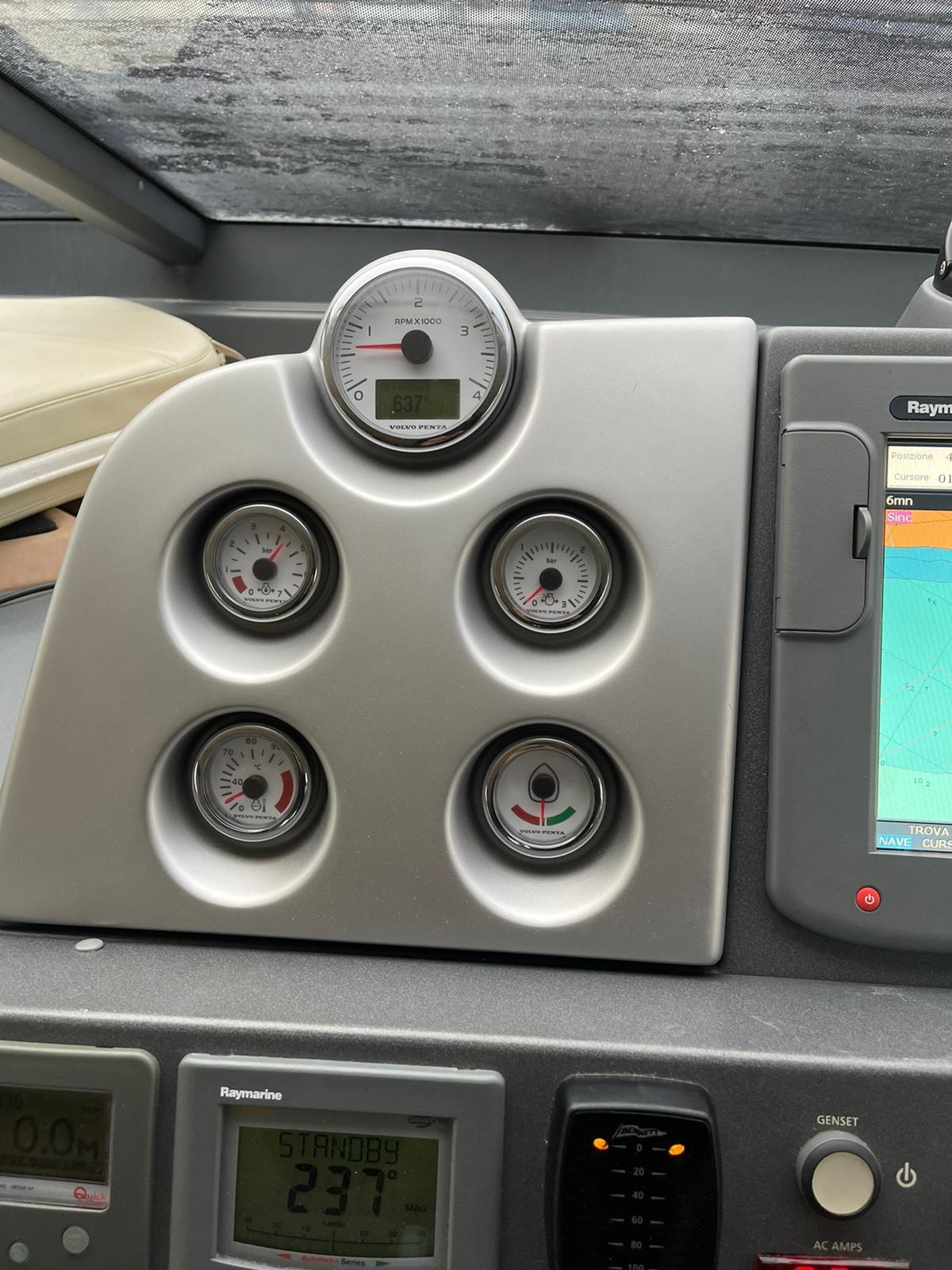 Rudder angle indicator, Radar Antenna (Raystar 125), Electronic engine control (Manette elettroniche), On-Board Computer, chronometer, Display, GPS (Raymarine Tridata ST60), Joystick, Log (Raymarine Tridata ST60), Autopilot (Raymarine ST6001 Plus), Plotter with GPS antenna (Raymarine), VHF Radio (Shipmate RS81).
