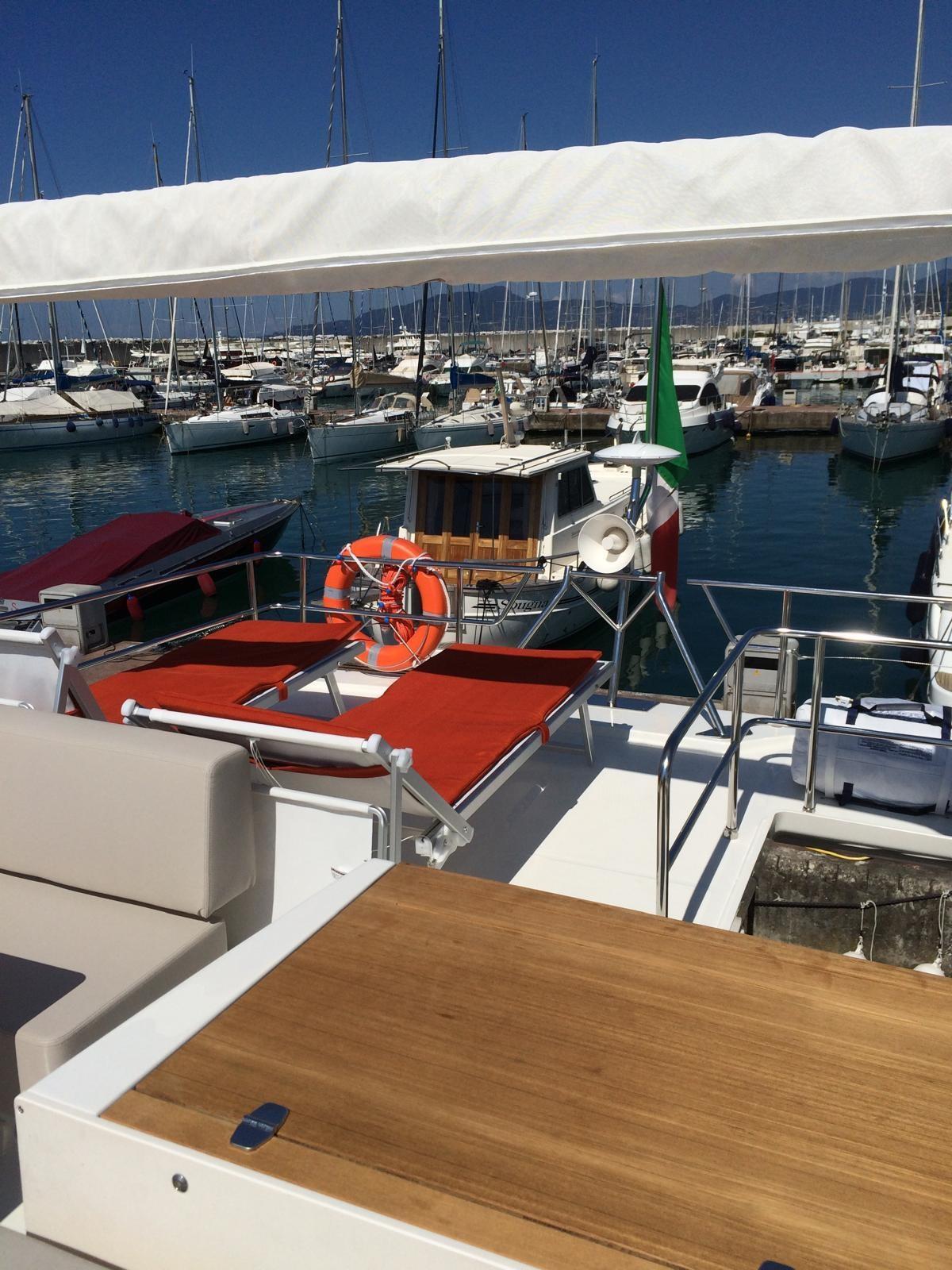 Engine Alarm, Guard rail, Deck Shower, Electric Flaps, Fire Extinguishing System, Courtesy Lights, Underwater lights, Gangway, Teak Cockpit, Shorepower connector, Water harbor connector system, Electric Windlass, swimming ladder, Saddles for tender, Tender, Horn.