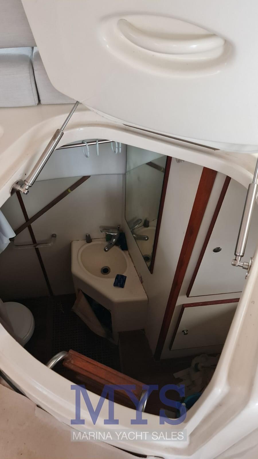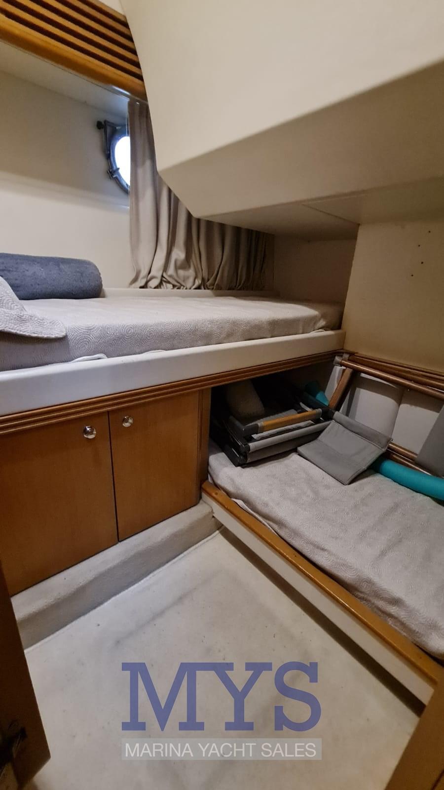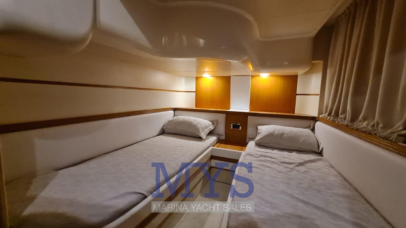 Forward of the large saloon is the owner's cabin with private bathroom. Towards the stern there are the 2 guest cabins and a second toilet. Helm station: on the starboard side of the cockpit, served by a 2-seater sofa. Ergonomic bridge with engine instrumentation, VHF radiotelephone, plotter with GPS, echo sounder, compass, autopilot with GPS interface Chart area: on the tables in the cockpit and in the internal saloon Galley area: located in the middle area of the boat, on the starboard side. Base and wall units in fine wood; cooking plate; microwave; cabinet with 270 liter fridge/freezer.
