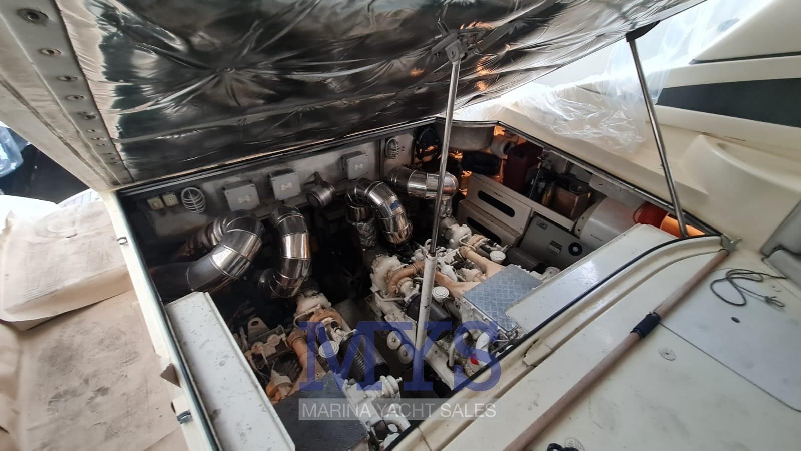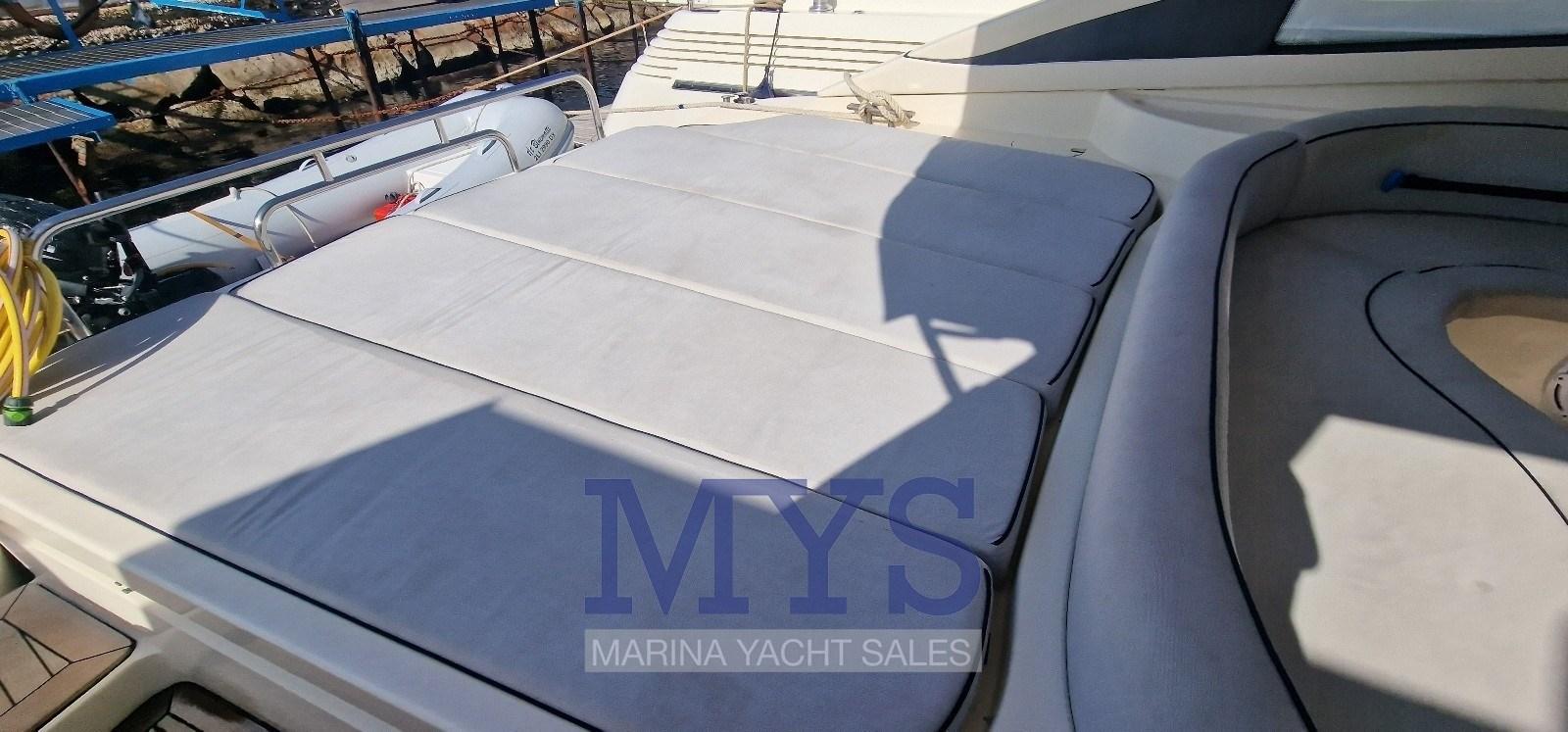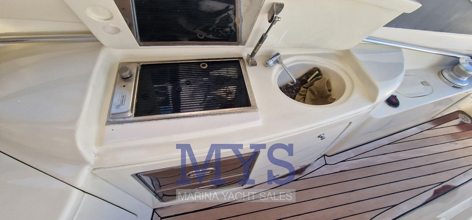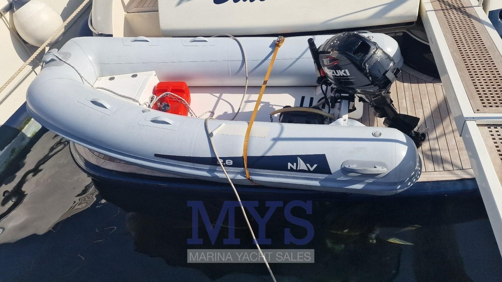 Fume/Gas Detector, Engine Alarm, Bilge Alarm, Anchor (Acciaio inox), Electric Engine Compartment Opening, Water pressure pump, 8 Batteries, Deck Shower, Hydraulic Flaps, Tender Crane, Fire Extinguishing System, Flaps Indicators, Washbasin in the cockpit, Courtesy Lights, Gangway (a scomparsa), Platform (in teak), Manual Bilge Pump, Teak Cockpit, Shorepower connector, Water harbor connector system, Voltage Rectifier, Electric Windlass, swimming ladder, cockpit table, Tender (2.80), Horn, 2 Stern Winches, Bow Winches.