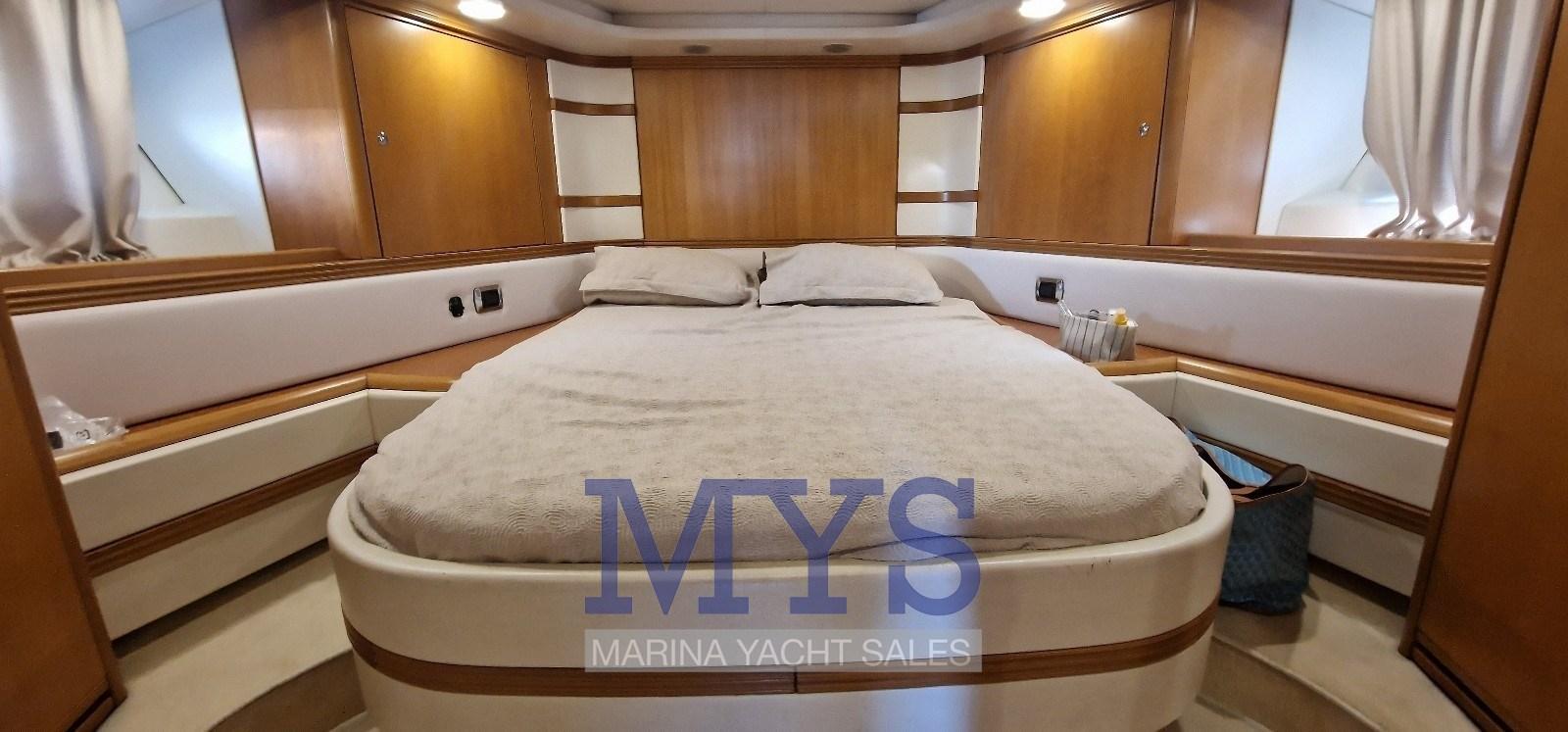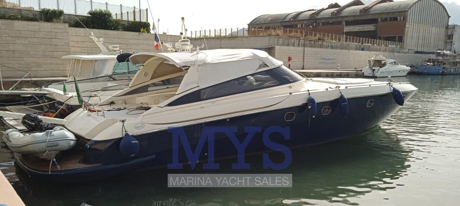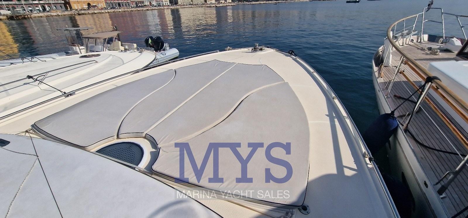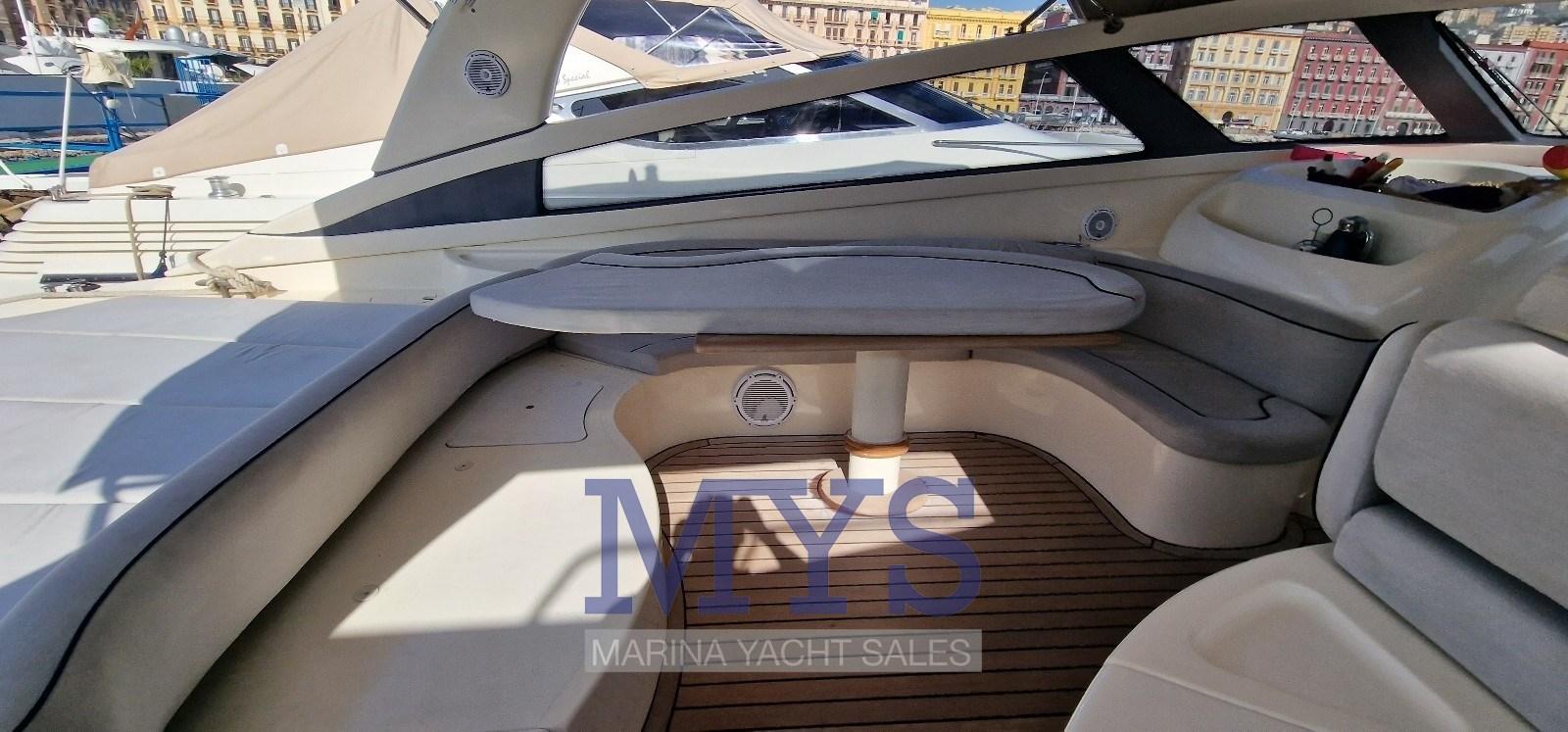 Fume/Gas Detector, Engine Alarm, Bilge Alarm, Anchor (Acciaio inox), Electric Engine Compartment Opening, Water pressure pump, 8 Batteries, Deck Shower, Hydraulic Flaps, Tender Crane, Fire Extinguishing System, Flaps Indicators, Washbasin in the cockpit, Courtesy Lights, Gangway (a scomparsa), Platform (in teak), Manual Bilge Pump, Teak Cockpit, Shorepower connector, Water harbor connector system, Voltage Rectifier, Electric Windlass, swimming ladder, cockpit table, Tender (2.80), Horn, 2 Stern Winches, Bow Winches.