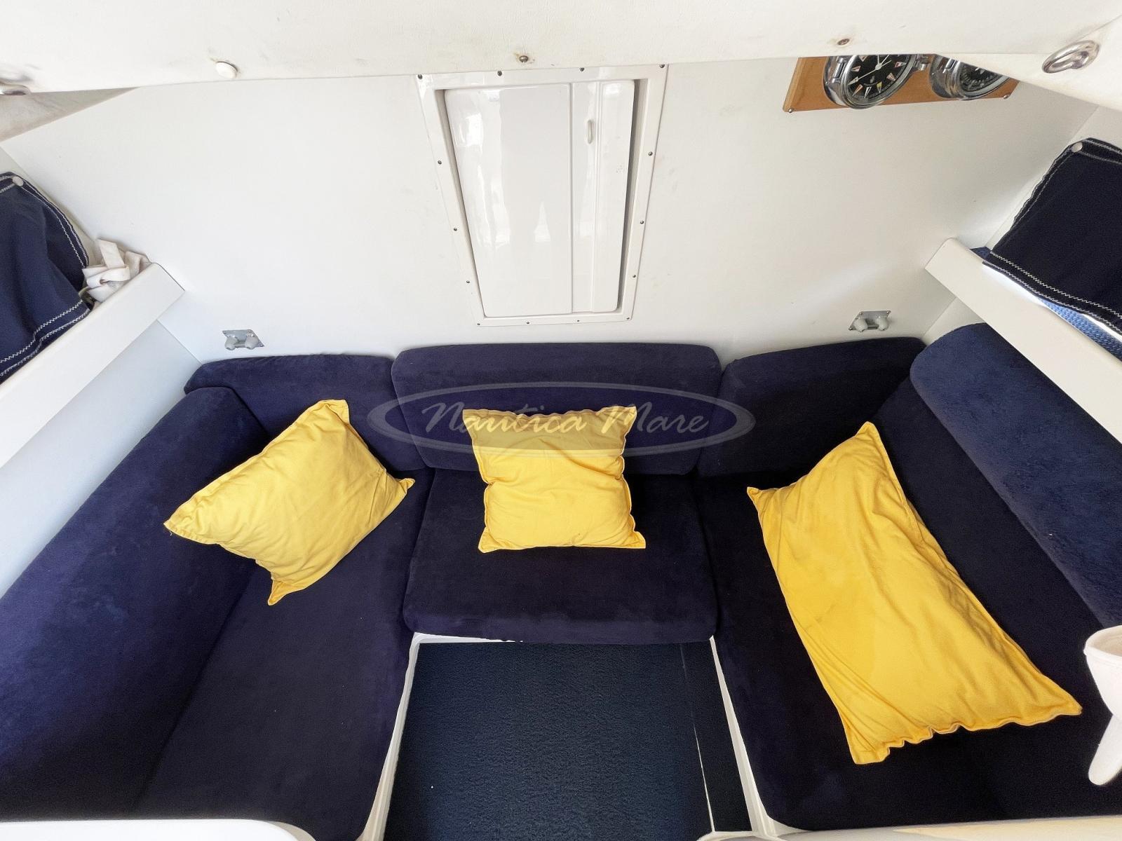 The very large sundeck in the bow, with table and retractable awning, is certainly the most convivial area of the boat. The steering console is also large and generous: 3 people are accommodated in the helm chair and the windshield, high and enveloping, together with the roll-bar and the awning guarantee protection during navigation. Guests on board are protected by a high and secure perimeter pulpit-handrail that opens towards the stern for access to the swim platform and towards the bow for access to the winch. Also ideal for charter use.