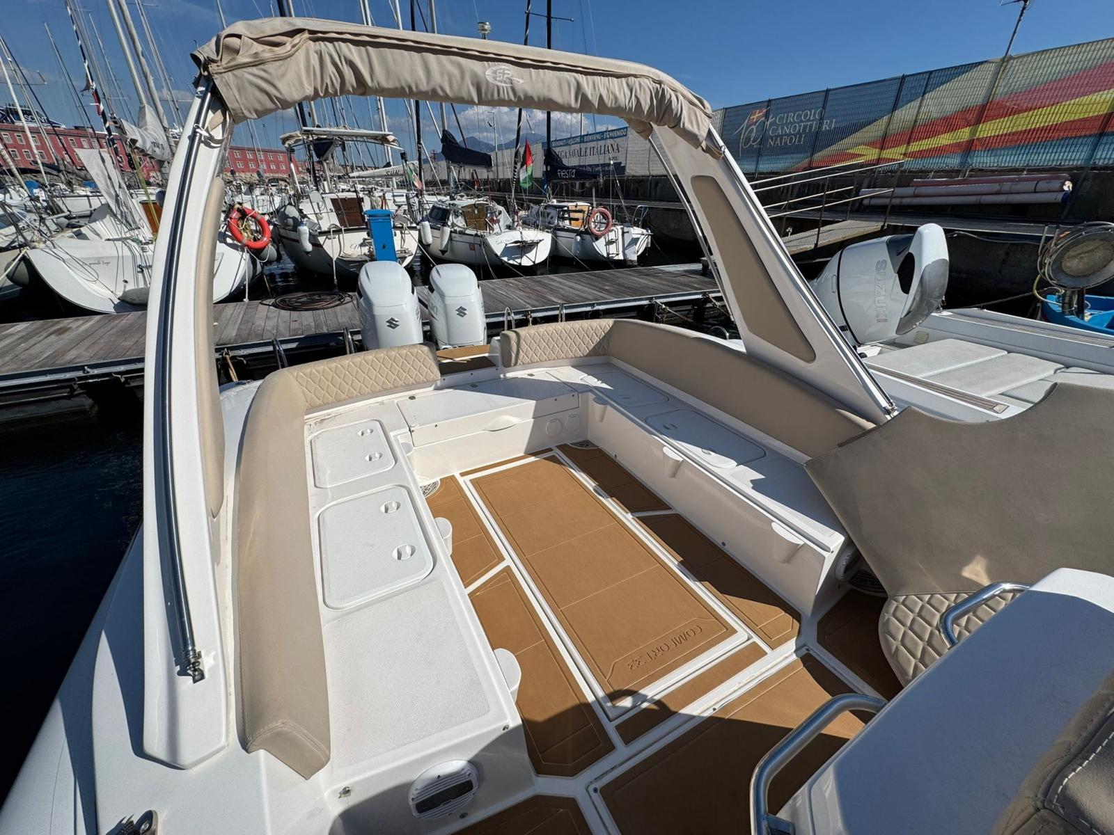 Engine Alarm, Bilge Alarm, Water pressure pump, 2 Deck Shower (A POPPA E PRUA), Courtesy Lights (LED), Automatic Bilge Pump, Manual Bilge Pump, Shorepower connector, Rollbar (CON LUCI), Electric Windlass, swimming ladder (DOPPIA), Table.