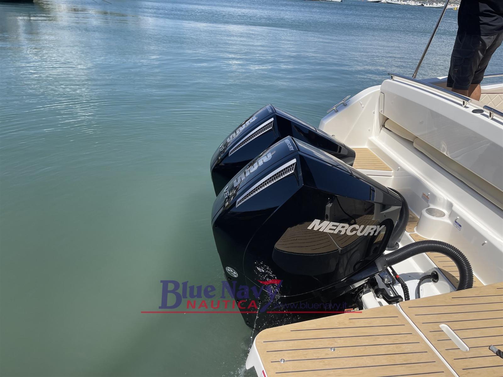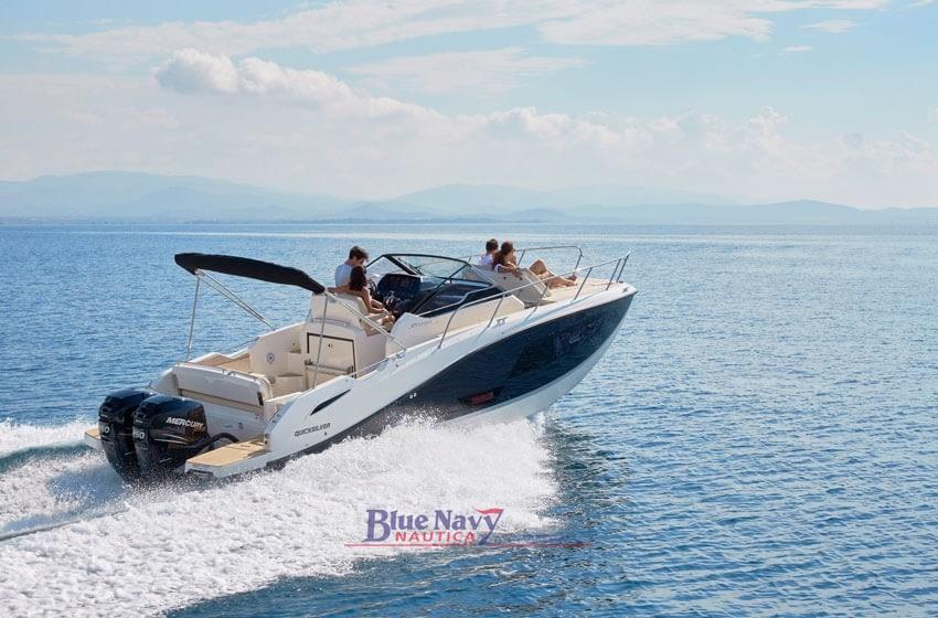 Used boat for sale - Quicksilver 875 Sundeck -from 2023, powered by the pair of Mercury 225hp V6 engines with about 120 hours of navigation. In addition to the standard equipment, it is equipped with Smart Pack (folding seat on the right, tilting pilot seat, sundeck in the cockpit, awnings in the cabin, refrigerator, microwave oven, refrigerator, LPG stove, mooring kit), extension of the aft platforms, electric winch, electrical socket on the quay, electric flaps, awning, dashboard cover + seat, bow thruster, VHF