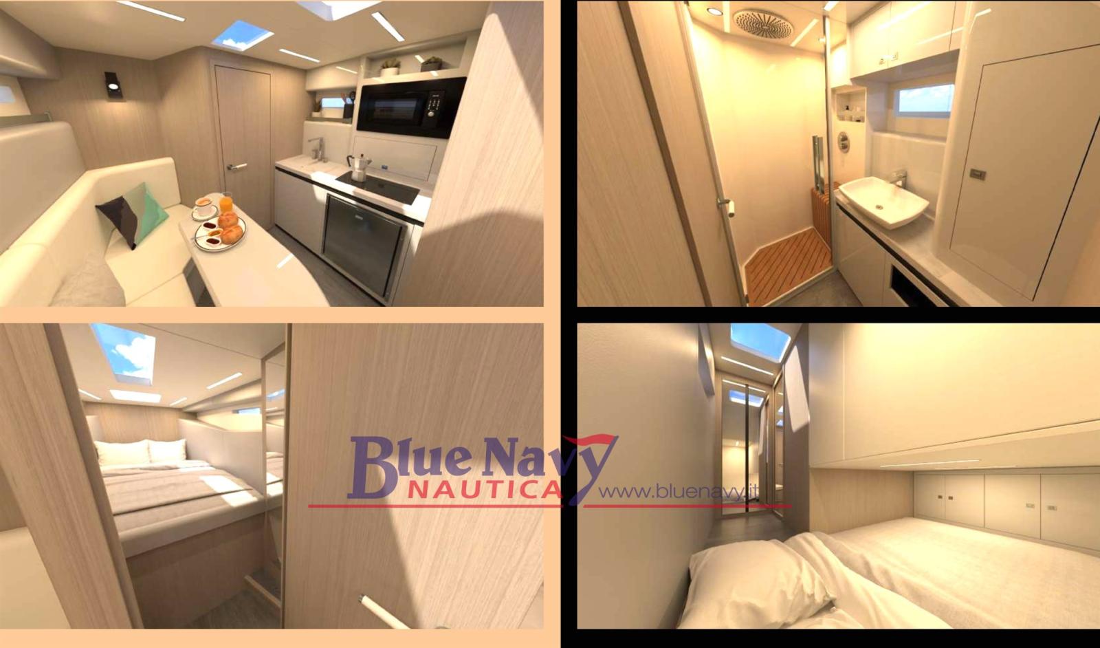 Spaces on board: large aft platform with sunbathing area and spacious lockers; in the bow, king-size sundecks with elegant stainless steel handrails and comfortable and protected passages with strategic handrails.