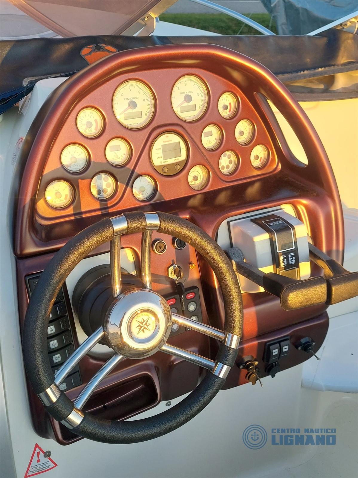 CONSOLE: double trim control, indicators (engine rpm x2, dual data computer, trim indicator x2, temperature indicator x2, oil pressure indicator x2, alternator indicator x2, engine error indicator x2, fuel gauge), USB sockets, double mechanical throttle unit, key assembly (3 keys), 2 adjustable and folding driver's seats