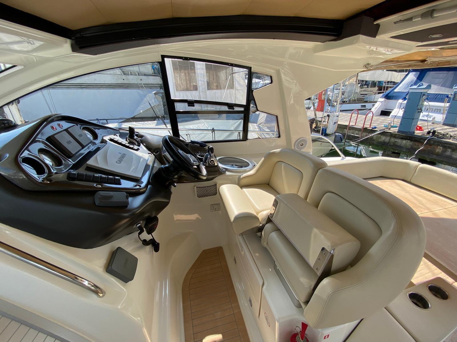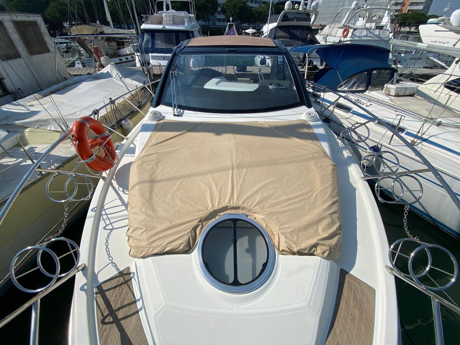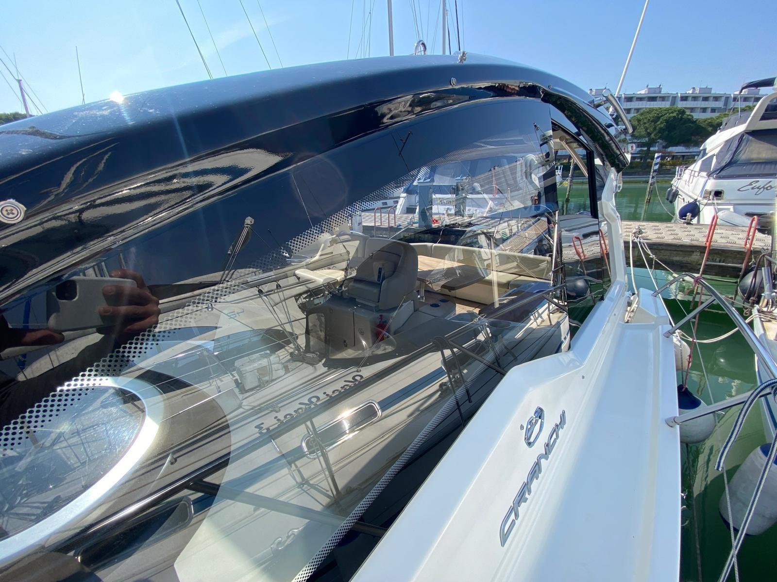 Bar angle; Compass; Electronic motor control; On-board computer; Chain meter counter; Echo sounder; GPS (Garmin Map 7412); Joystick; Navigation lights; Autopilot; VHF radio; Engine alarm; Bilge alarm; Anchor (Oversized chain 60 meters); Batteries (Series of batteries n.5 New); Charger; Outside shower (aft and bow); Bow thruster; Electric flaps; Hard Top; Sink in the cockpit; Courtesy lights; Walkway; Bilge Pump; 220V shore socket; Electric windlass; Bathing ladder, Tender Saddles; Cockpit table; Trumpet; Air conditioning; Boiler; Reversible climate; Fuel tank indicator; Water tank indicator; Oil pressure gauge in the engine; Engine temperature indicator; Interior wooden floor; 220V internal sockets; Electric marine toilet; Speakers; TV system; AM/FM radio; Stereo; TV; Kitchen; Stove (gas below deck); External refrigerator; Indoor refrigerator; Microwave; Glass-ceramic plate (External in the cockpit); Cockpit cover; Complete cushions; Blinds; Window covers.