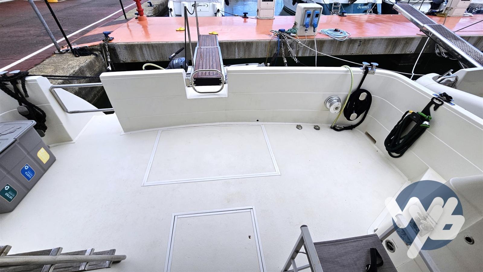 Non-slip cockpit and stern platform. Cockpit table and chairs. New inverter.