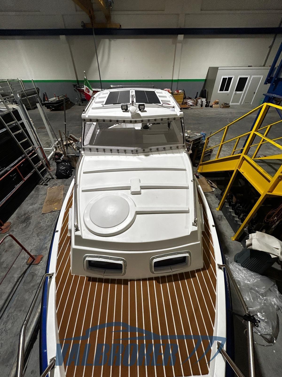 Works carried out between September 2023 and July 2025: hull brought to zero and painted with Stoppani Isofan Marine paints, new cooperage, new stainless steel hardware, 8 new portholes and new windshield glass in anti-breakage polycarbonate. New propeller support, shaft, bearings and seals. New electrical system with two batteries (200Ah for services + 75Ah for motor), shore charger, double 200W solar panel with regulator, galvanic isolator, double battery switch. Interior: all woods (Okumé plywood) stripped, sanded and repainted with specific paints. New nautical interior carpet. New sea intakes.