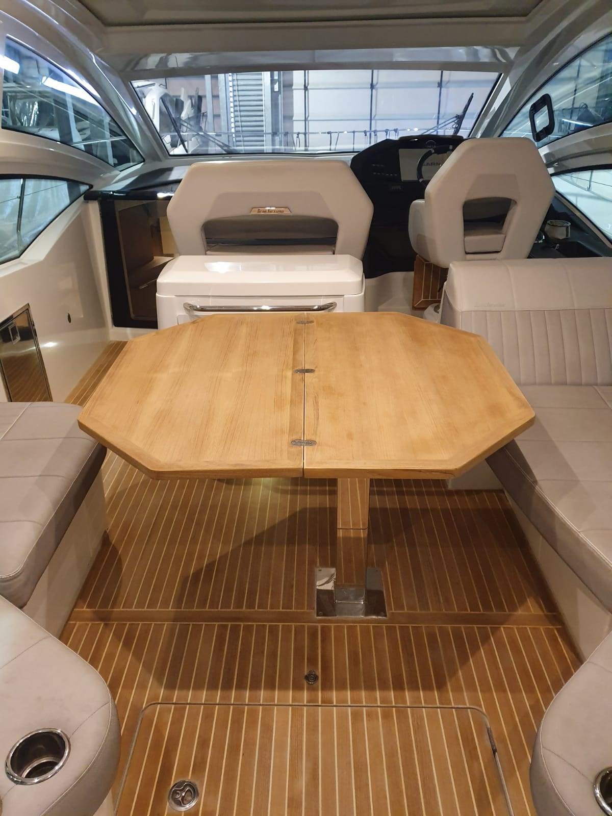 Bilge Alarm, Water pressure pump, Batteries (115), Deck Shower, Electric Flaps, Hard top, Washbasin in the cockpit, Courtesy Lights, Underwater lights, Gangway, Platform, Entry door, Teak Cockpit, Shorepower connector, Water harbor connector system, Electric Windlass, swimming ladder, cockpit table, Living Room Foldable Table, Horn.