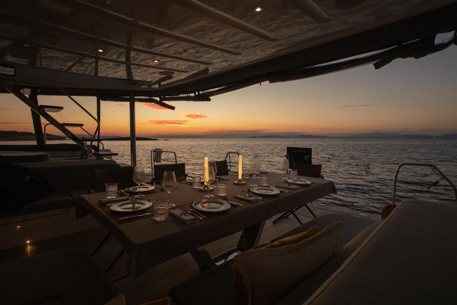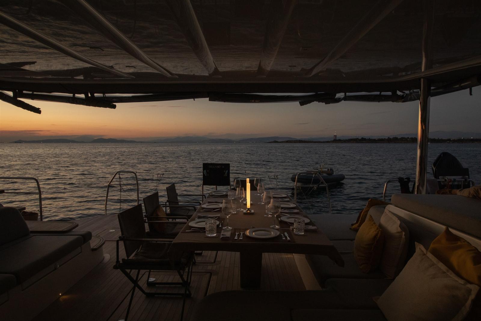 Numerous outdoor relaxation areas, the flybridge lounge, the front cockpit and the vast aft cockpit, offer versatile spaces for sun, shade and social life. The optimized trim and sail plan ensure safe, fast and effortless cruising, whether with a small crew or with a professional crew.
