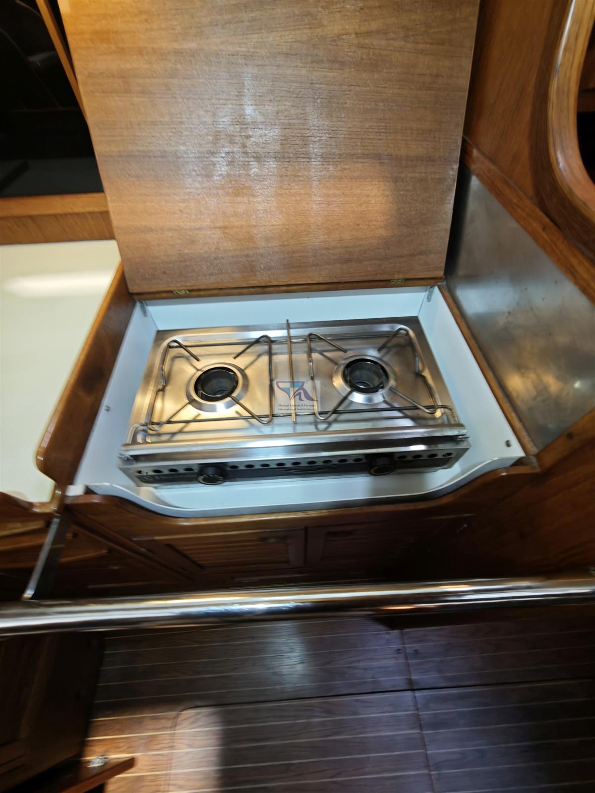 Galley (Spüle), Burner (2-flammig, Spiritus), Refrigerator (Waeco Kühlbox).