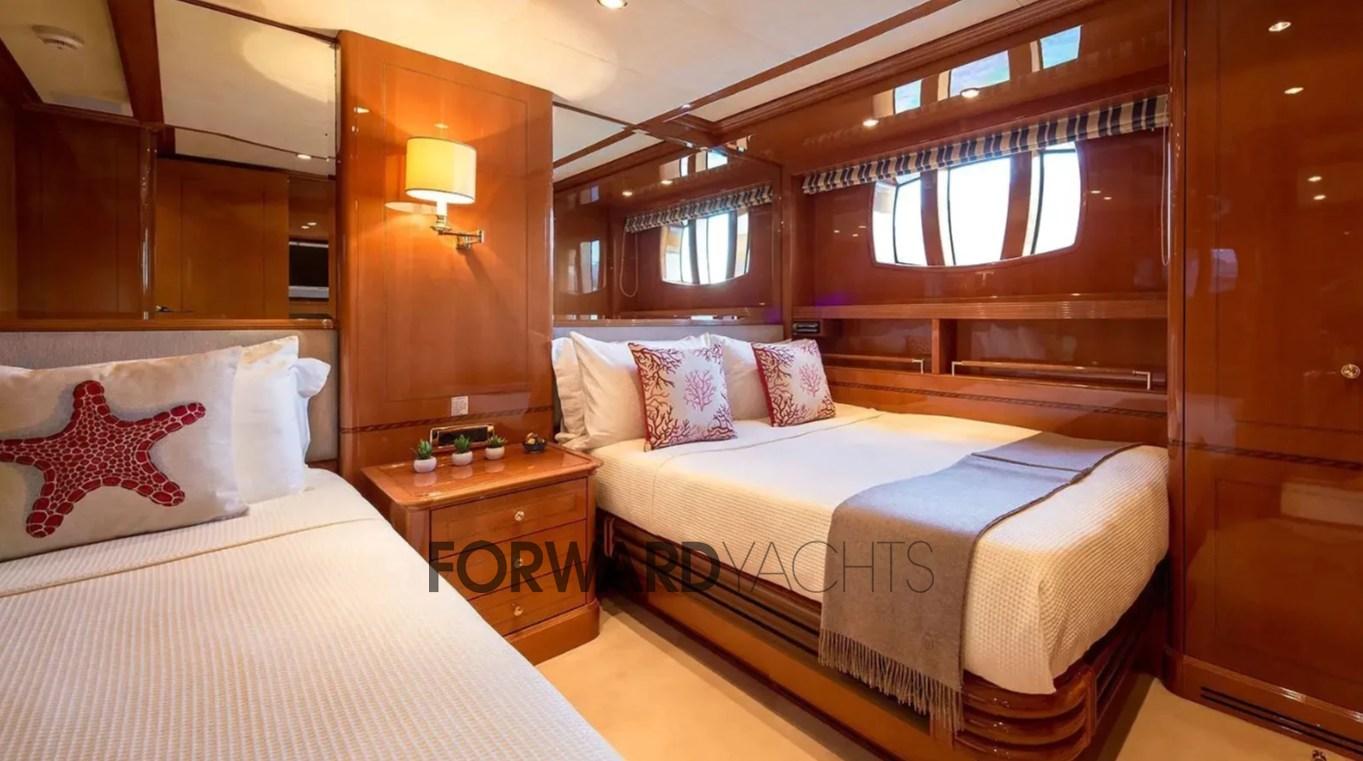 The owner's suite is located on the main deck, a rare feature for a yacht of this size, while the lower deck offers a spacious full-beam VIP and two doubles with single beds on the floor.