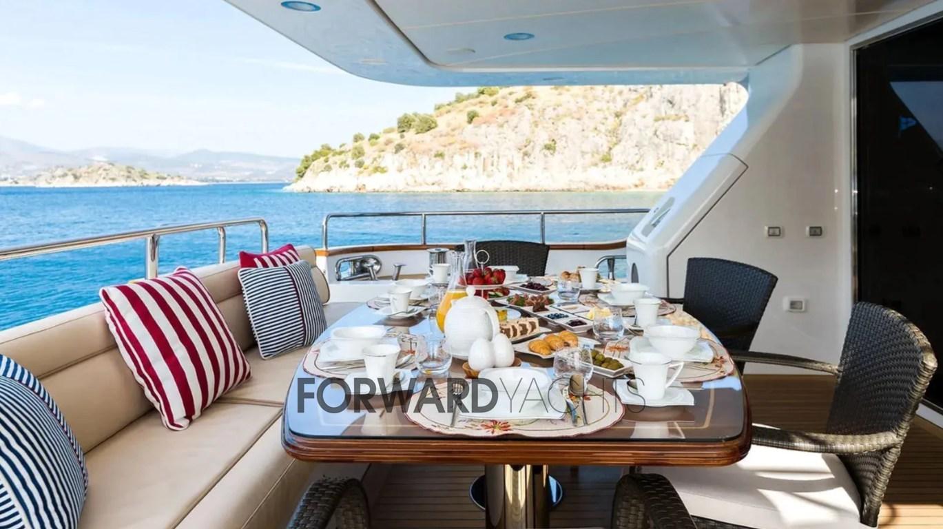 The saloon and dining area share an open plan layout on the main deck, creating a bright and versatile space for guests. The outdoor areas are spread over three decks.