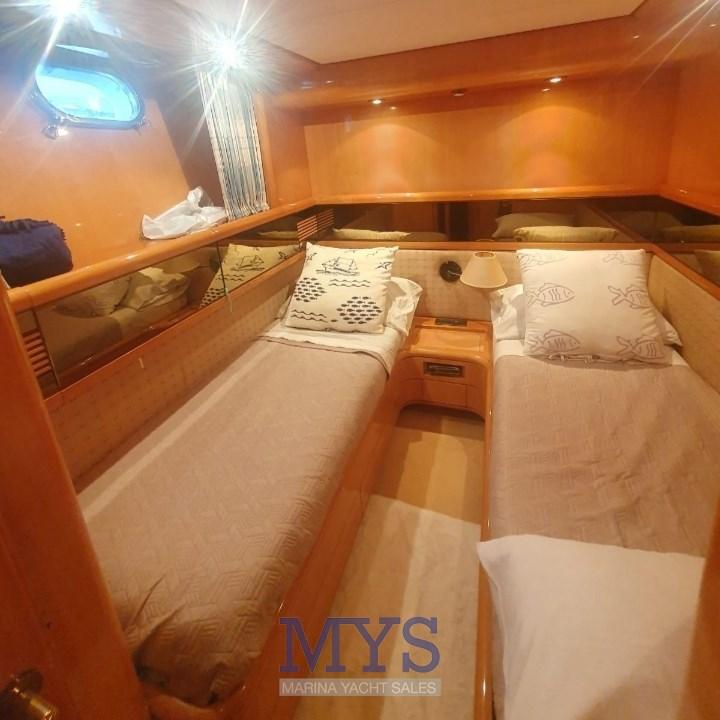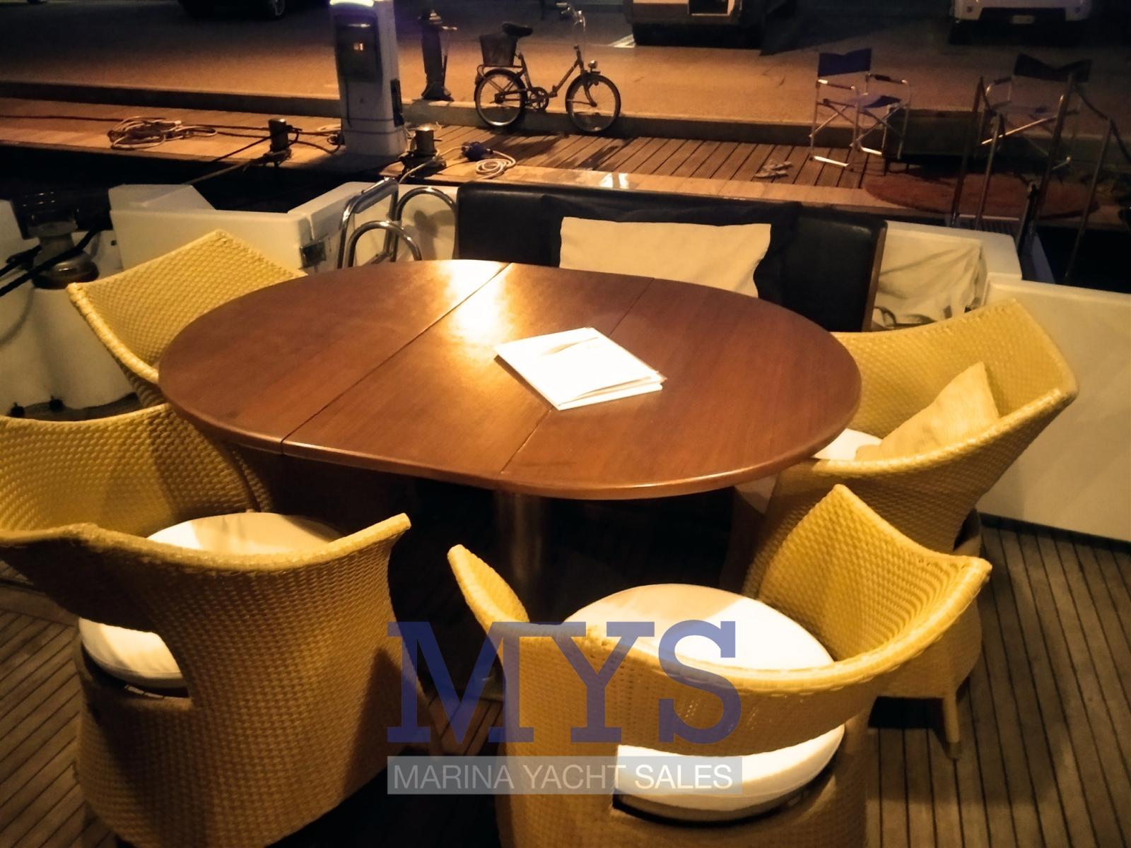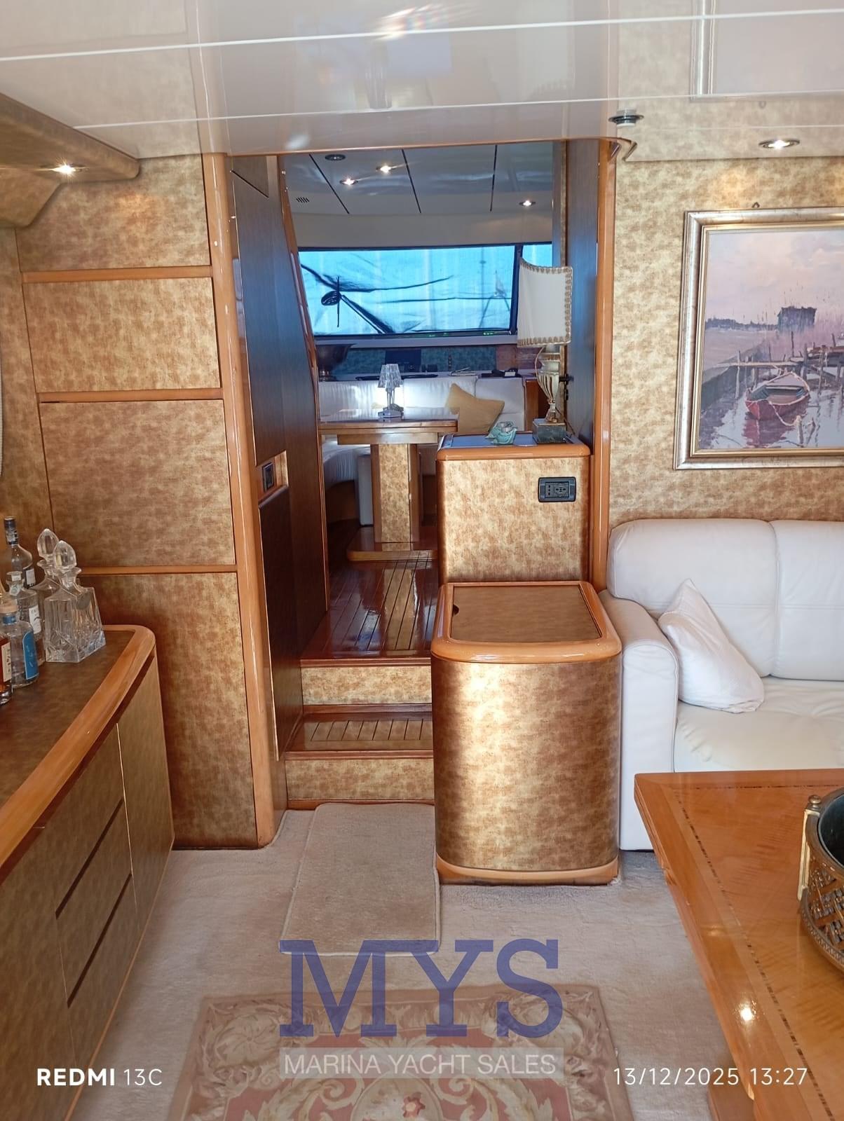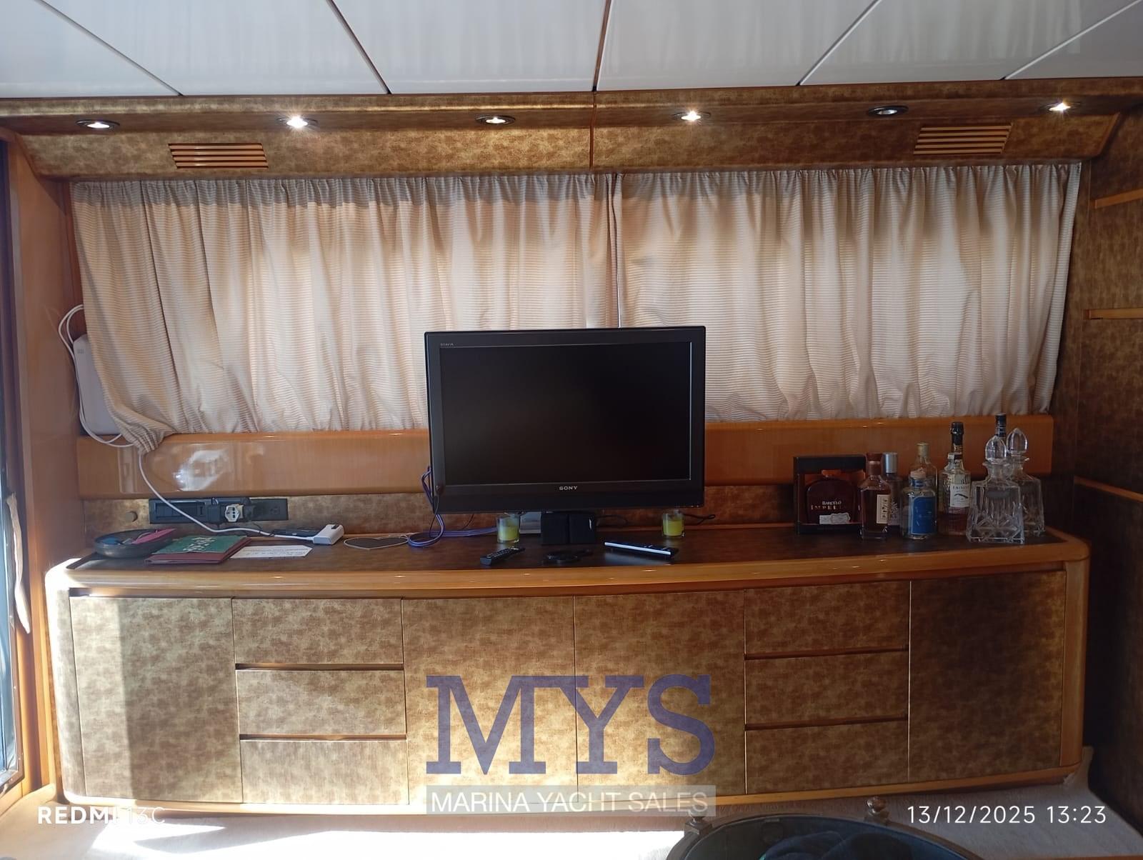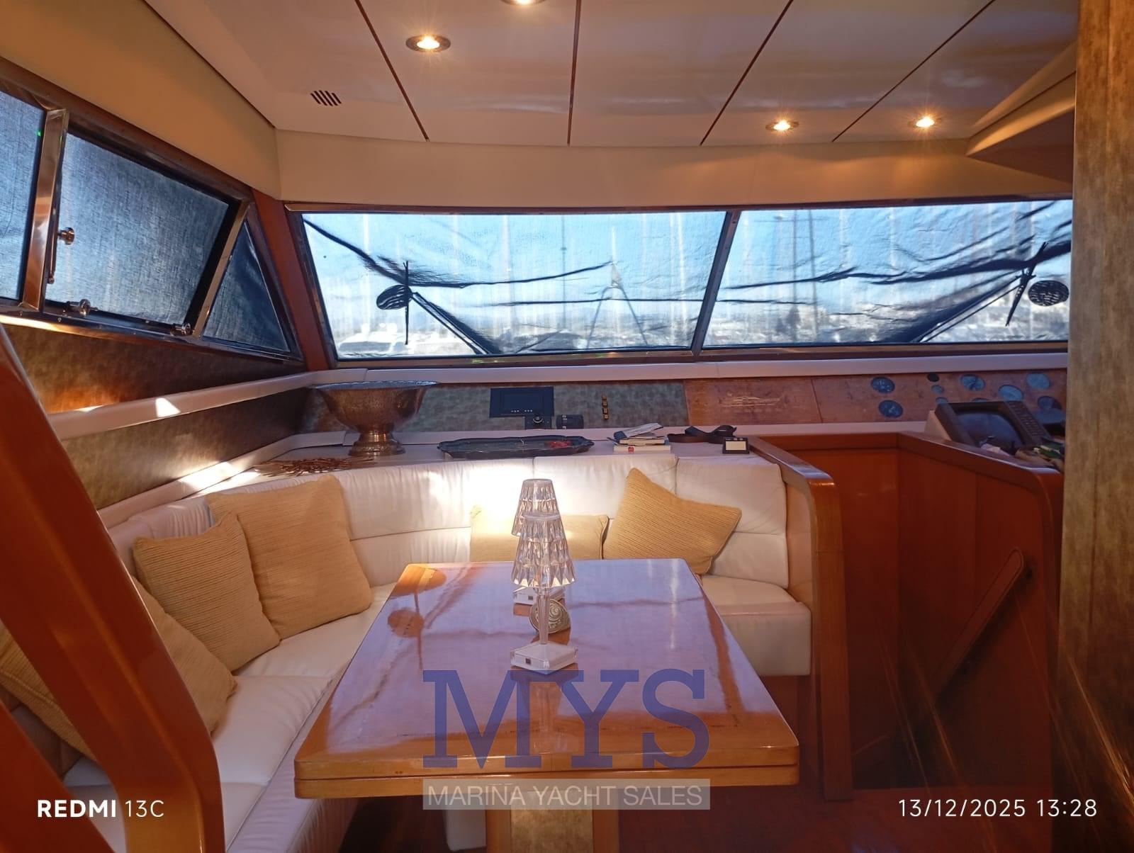 Engine Alarm, Bilge Alarm, Water pressure pump, Deck Shower, Twin Steering, Directional Spotlight, Hydraulic Flaps, Fire Extinguishing System, Flaps Indicators, Anchor Chain Washdown, Courtesy Lights, Gangway, Platform, Automatic Bilge Pump, Entry door, Side door, Teak Cockpit, Shorepower connector, Water harbor connector system, Voltage Rectifier, Electronic instrumentation repeater, Electric Windlass, swimming ladder, cockpit table, Horn, Bow Winches.