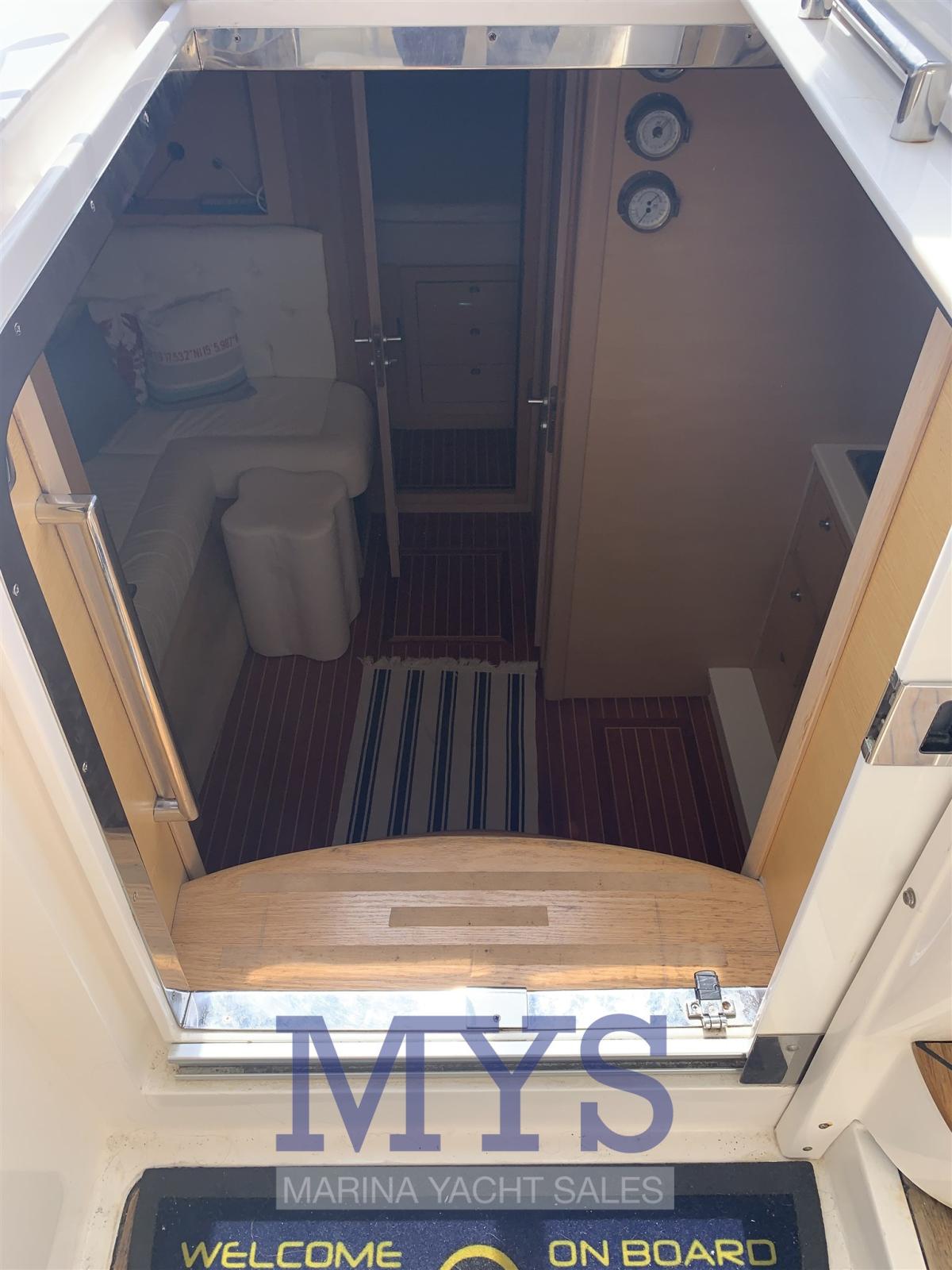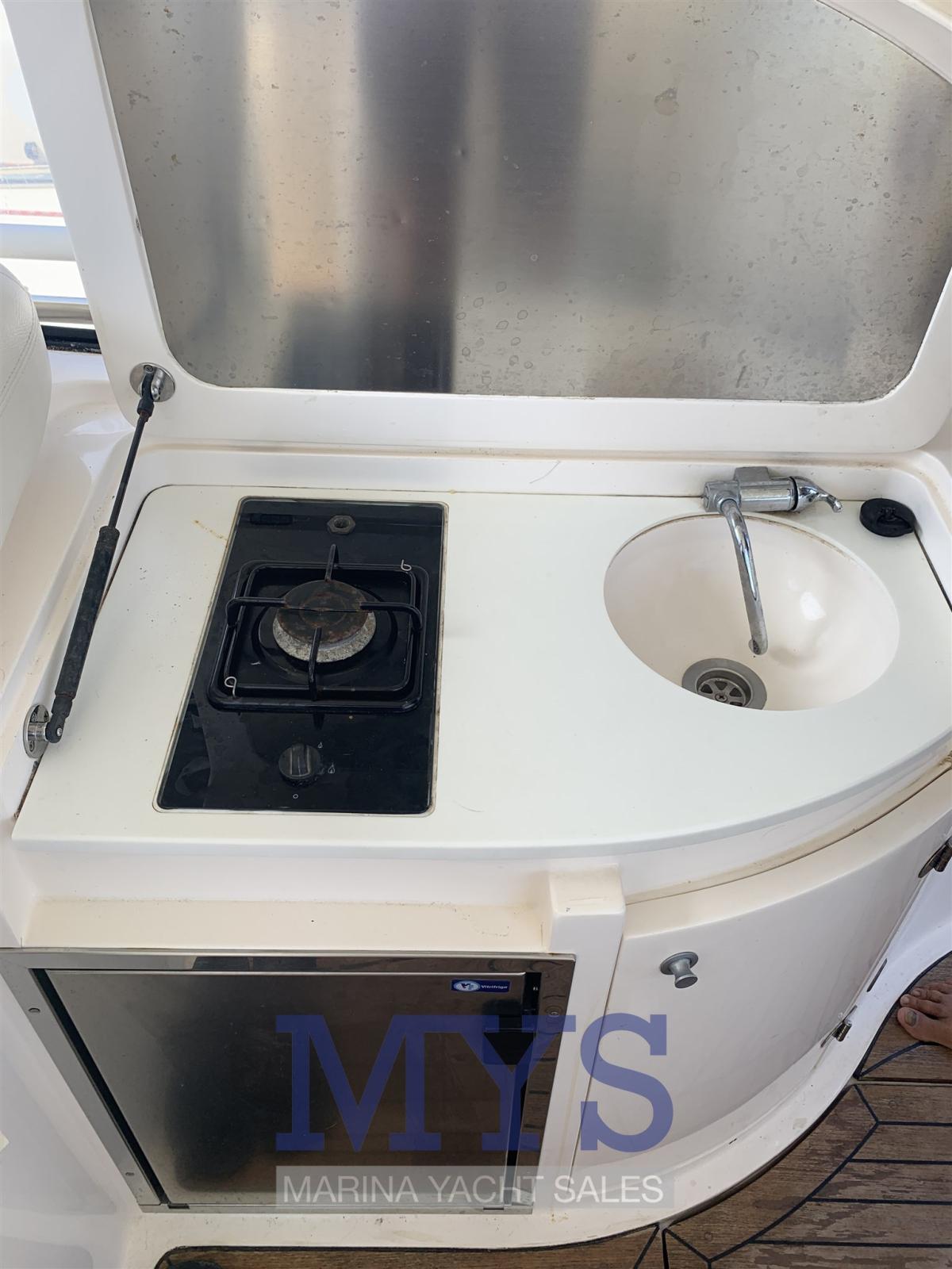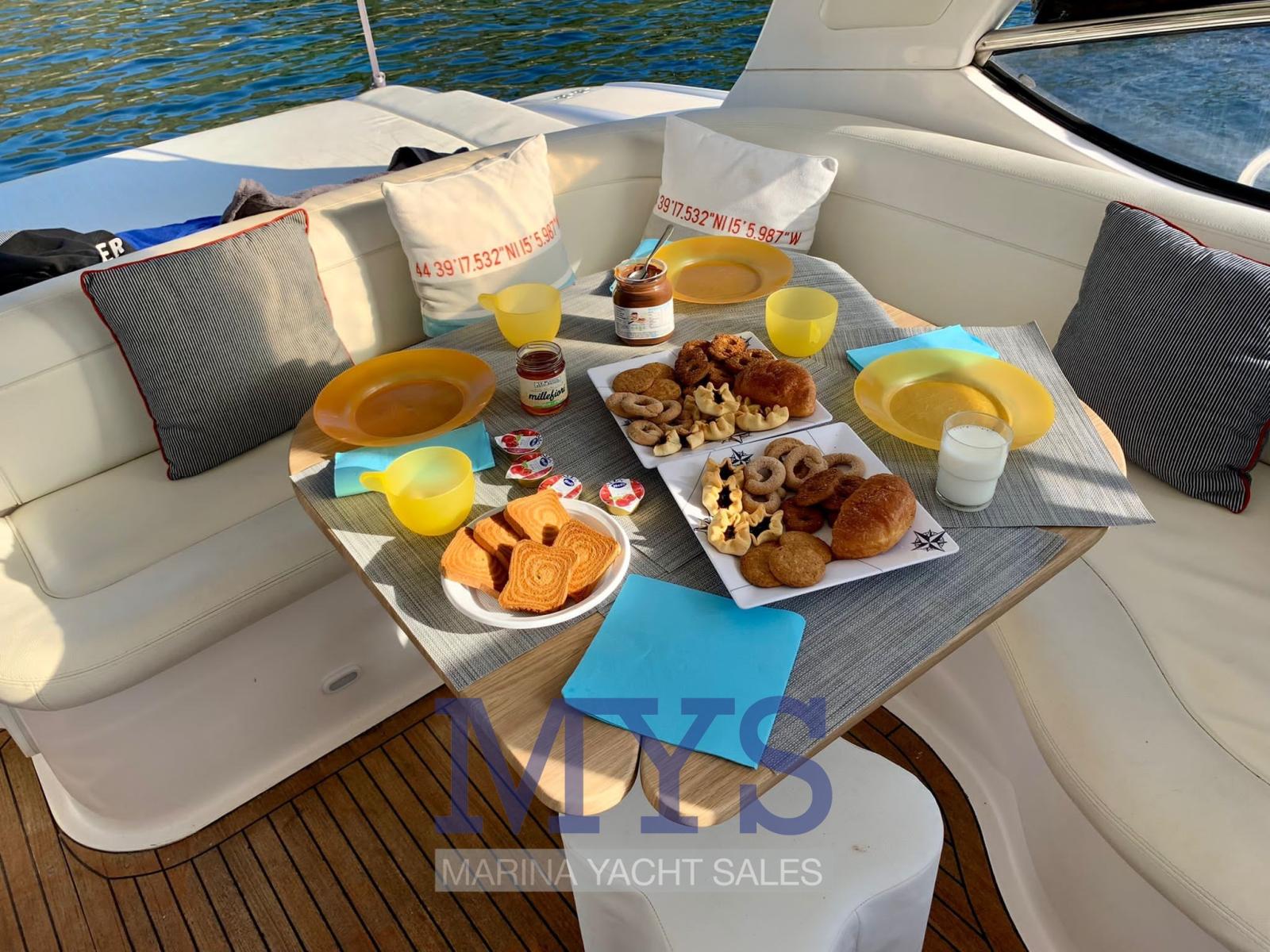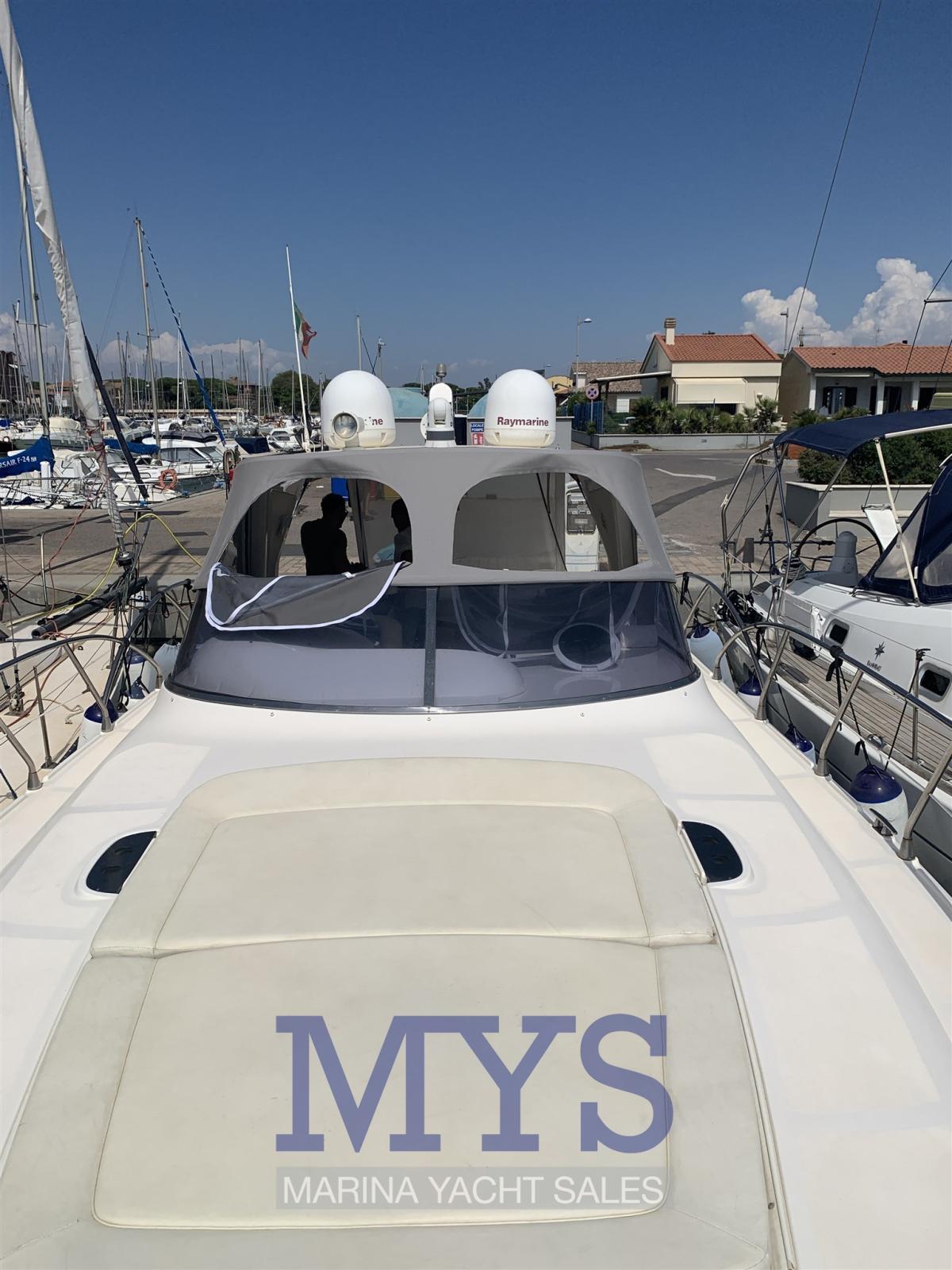 Engine Alarm, Electric Engine Compartment Opening, Water pressure pump, Special Colour, Deck Shower, Hydraulic Flaps, Fire Extinguishing System, Flaps Indicators, Courtesy Lights, Underwater lights, Gangway (A SCOMPARSA), Platform, Automatic Bilge Pump, Teak Cockpit, Shorepower connector, Voltage Rectifier, Rollbar, Electric Windlass, swimming ladder, cockpit table, Horn.