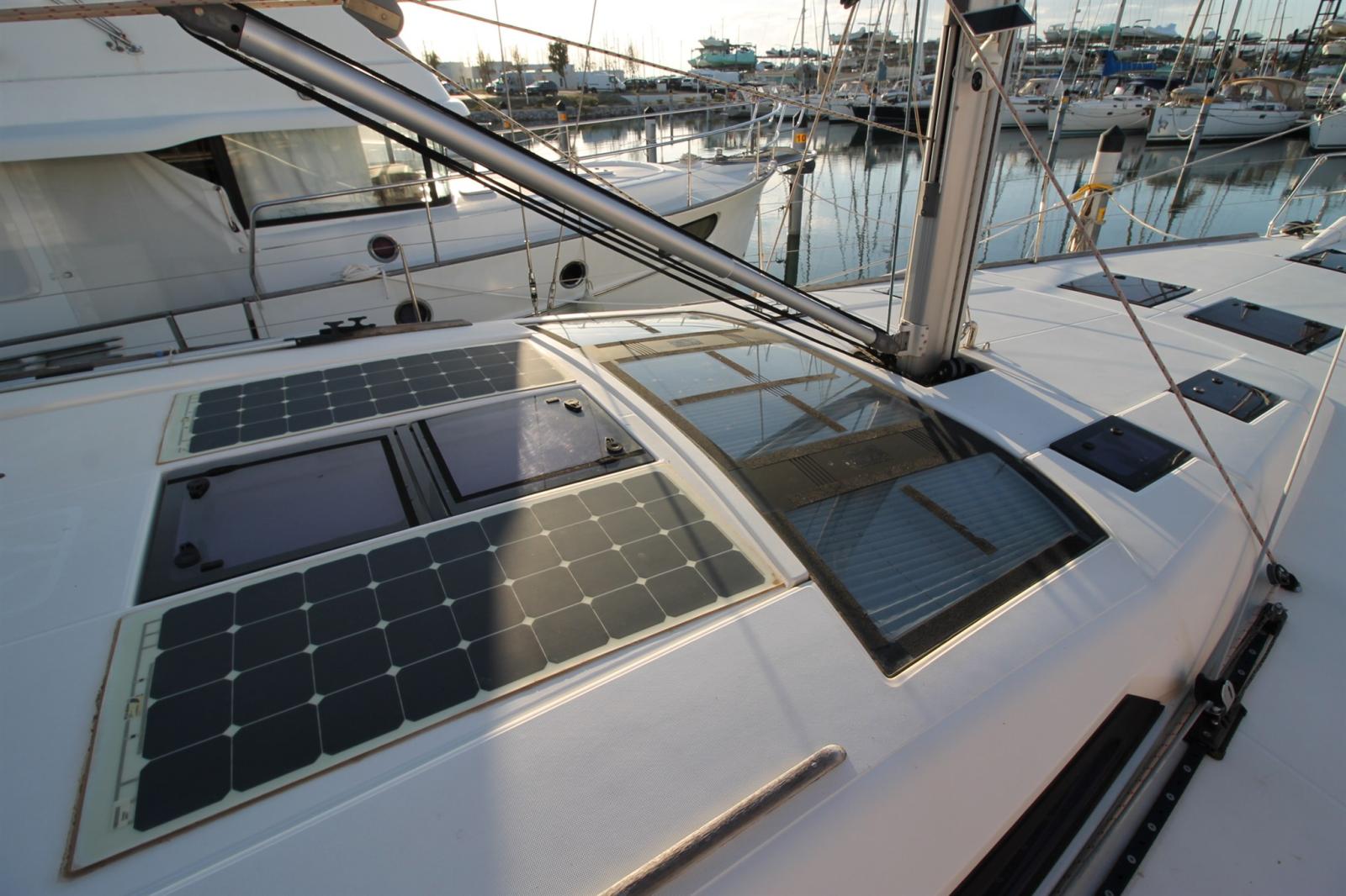 Anchor (DELTA 60m de chaine de 10 + 40m cablot), Selftailing winch, Water pressure pump, 5 Batteries (x GEL), Shore power cable, Deck Shower (avec eau chaude), Twin Steering, Stern Thruster (hydrojet), Bow Thruster (hydrojet), Tender Garage, Washbasin in the cockpit, Battery Monitor, Auxiliary Engine (Honda 2cv), Solar panels, Manual Bilge Pump, Electric Windlass, swimming ladder, Outboard Engine Support Bracket, cockpit table (teck), Tender, 3 Winch Electric.