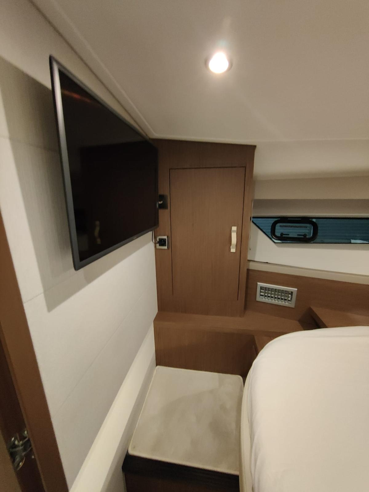 Teak in the platform, teak in the cockpit, folding cockpit table, galley in the platform, joystick, electronic handcuffs, electric flaps, gps, echo sounder, horn, vhf, lights in the cockpit, electric windlass, anchor and chain, air conditioning, tv,