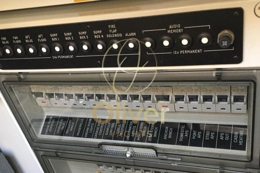 Rudder angle indicator, Radar Antenna, Electronic engine control, On-Board Computer, Chain counter, chronometer, Display, DSC vhf, Depth Sounder (SIMRAD), Maps and guides, Autopilot (SIMRAD), Plotter with GPS antenna, Control panel, Co-pilot seat, Engine Measuring Instruments.