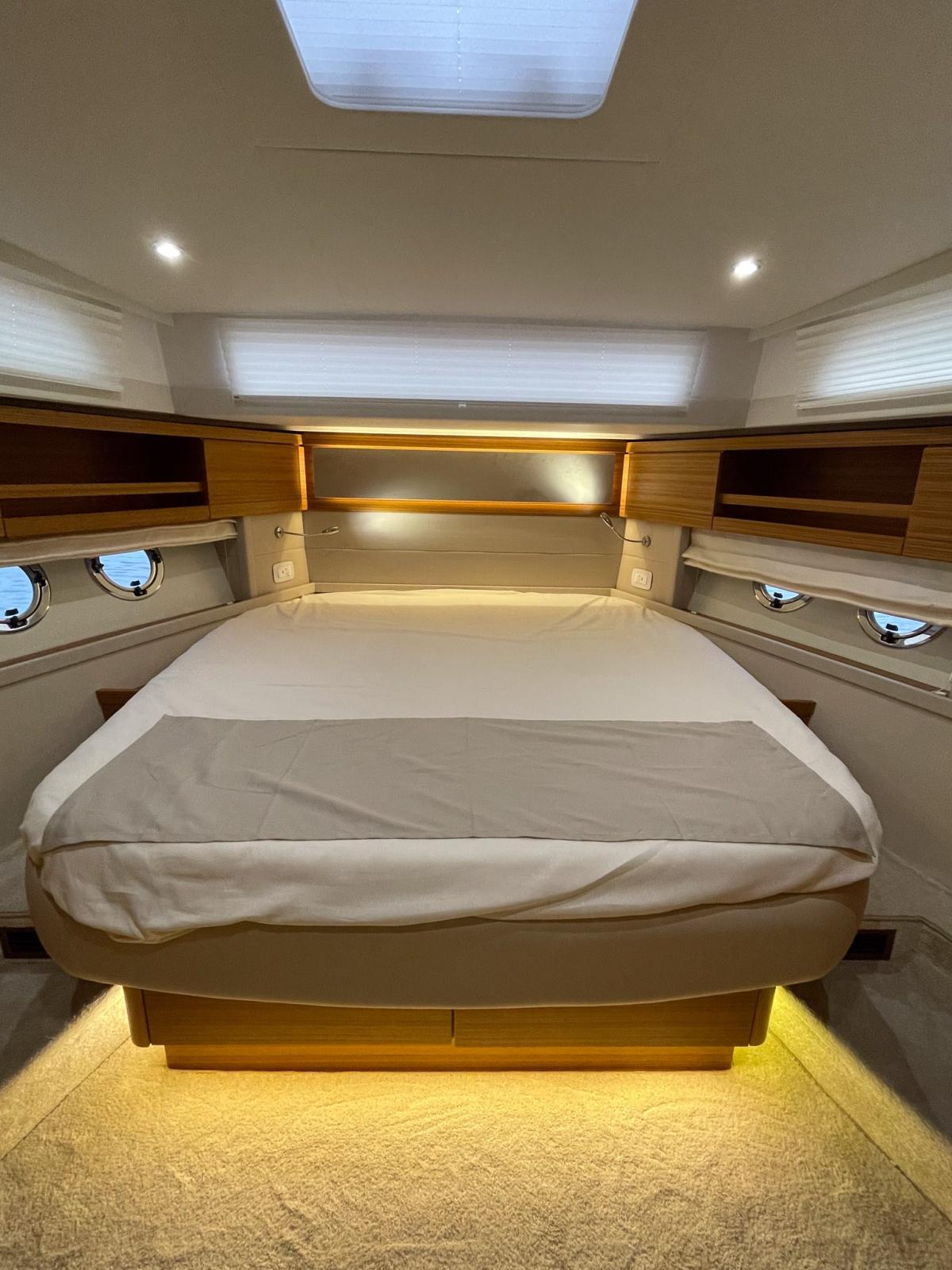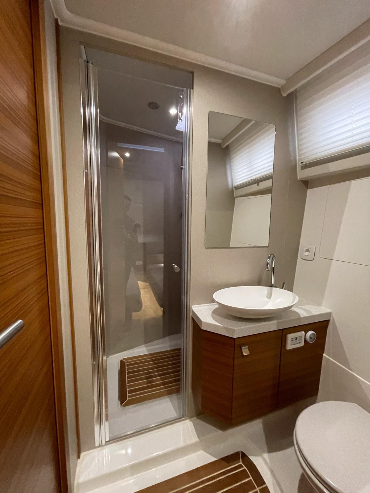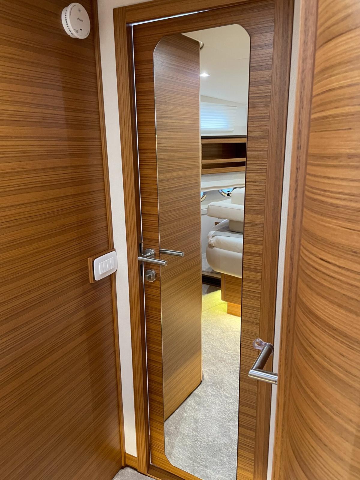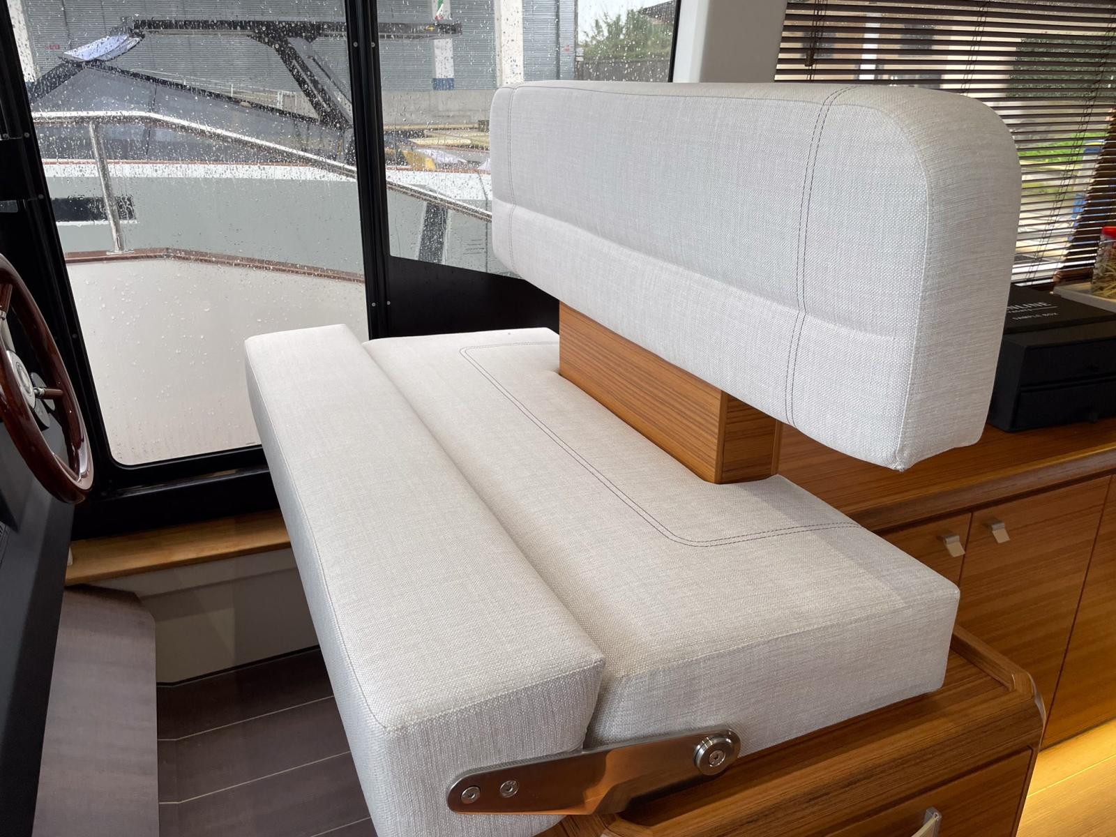 Eco teak decking in cockpit, decks and foredeck • Canvas cockpit outer covers • Mesh windscreen and side window outer cover • Tropical Reverse cycle air conditioning system, four units (saloon, guest and master cabins) 46,000 BTU • Water connection • Chain and anchor washing, 12V, including water hose and nozzle • Mooring package (6 fenders 4 x mooring lines) • Washer/dryer 8 kg / 5 kg, 230V (grey water tank option mandatory) • Dishwasher 6 persons 230V (grey water tank option mandatory) • Generator (diesel) 11 kW/50Hz • Stern thruster incl. 2 x AGM battery • Search beacon with fly remote control • Flybridge galley (refrigerator, electric grill, sink with mixer), protective cover • Ice maker next to the refrigerator on the flybridge • Extra large bimini on the flybridge with stainless steel supports at the bow and stern incl. LED light - Protective covers for the sunbathing cushions on the flybridge - Gyroscopic stabilizer (Quick) - Hydraulic platform - Tenderlift (max lifting capacity: 300kg) - Upgrade: Hydraulic platform with capacity 500 kg - Support for dinghy on platform "Pop up Chocks" (max. lifting capacity: 150kg) - Hydraulic gangway with remote control 2.5 meters - 2 x Capstans (electric stern winch PORT+ STB) - Indirect LED lighting (step light on deck, on the access stairs to the flybridge, flybridge, saloon, stairs and helm station) - Retractable electric sun blind in the cockpit - 2 x Lumishore underwater double lights aft connected to Simrad plotter - Storage cabinet in the saloon storage room - Cablemaster shore power cable management system, electric (for air conditioning a second can be selected) - Mirror package: 1.6 m x 40 cm mirror on each cabin door