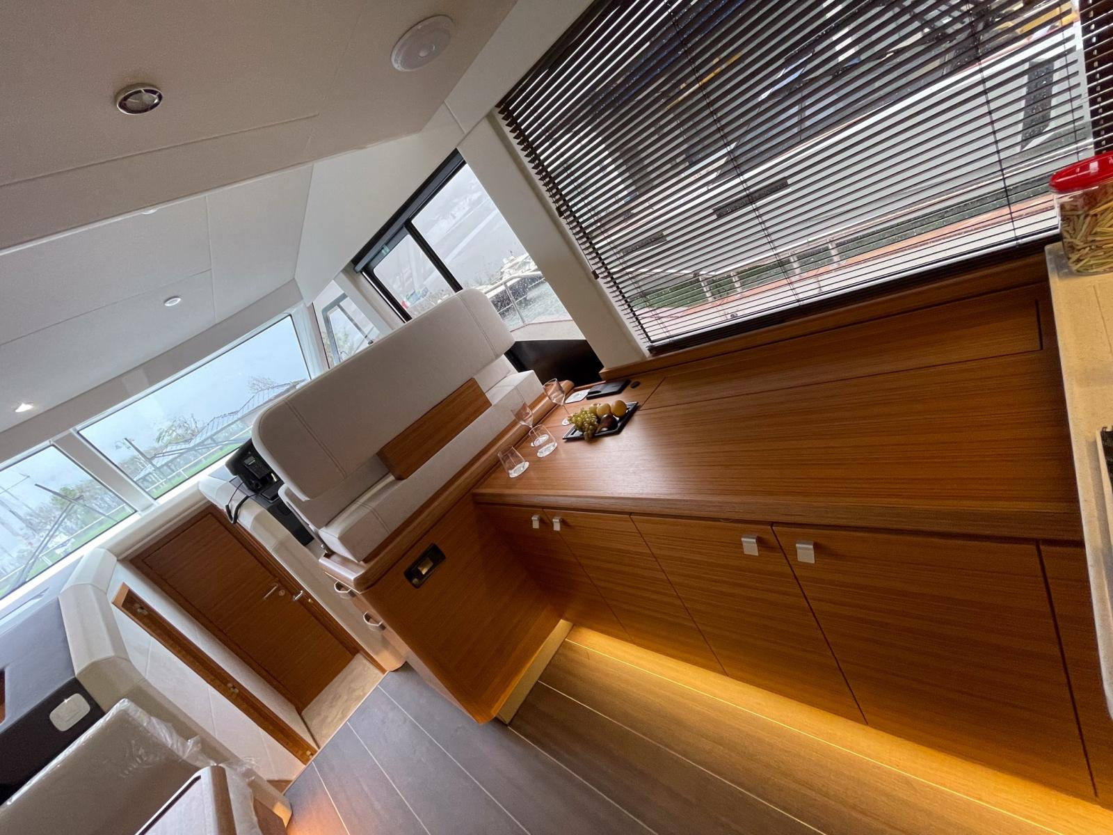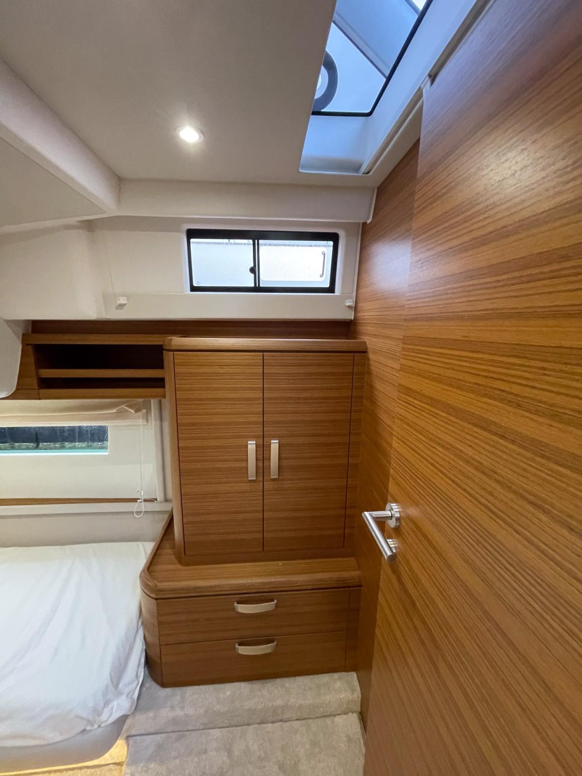 3 cabins, 2 luxury bathrooms with 2 separate showers (instead of 3 en-suite bathrooms) - Master island cabin/comfort bed - Saloon layout with sideboard on the right side - Wooden Venetian blinds Golden Teak colour - Rugana CREAM fabric upholstery - Gold Teak furniture incl.white leather details and sand carpet, dark laminate flooring - Striped flooring