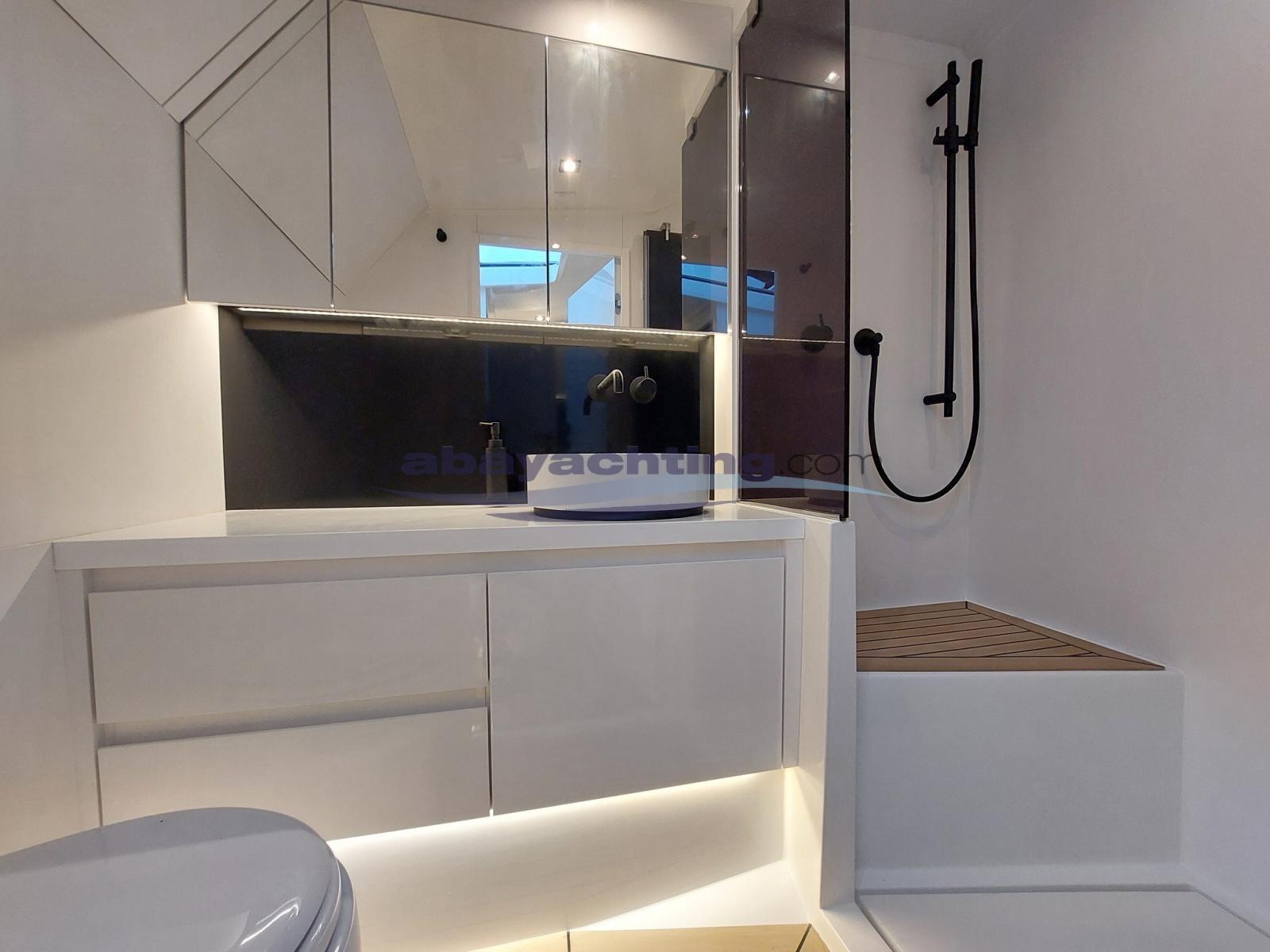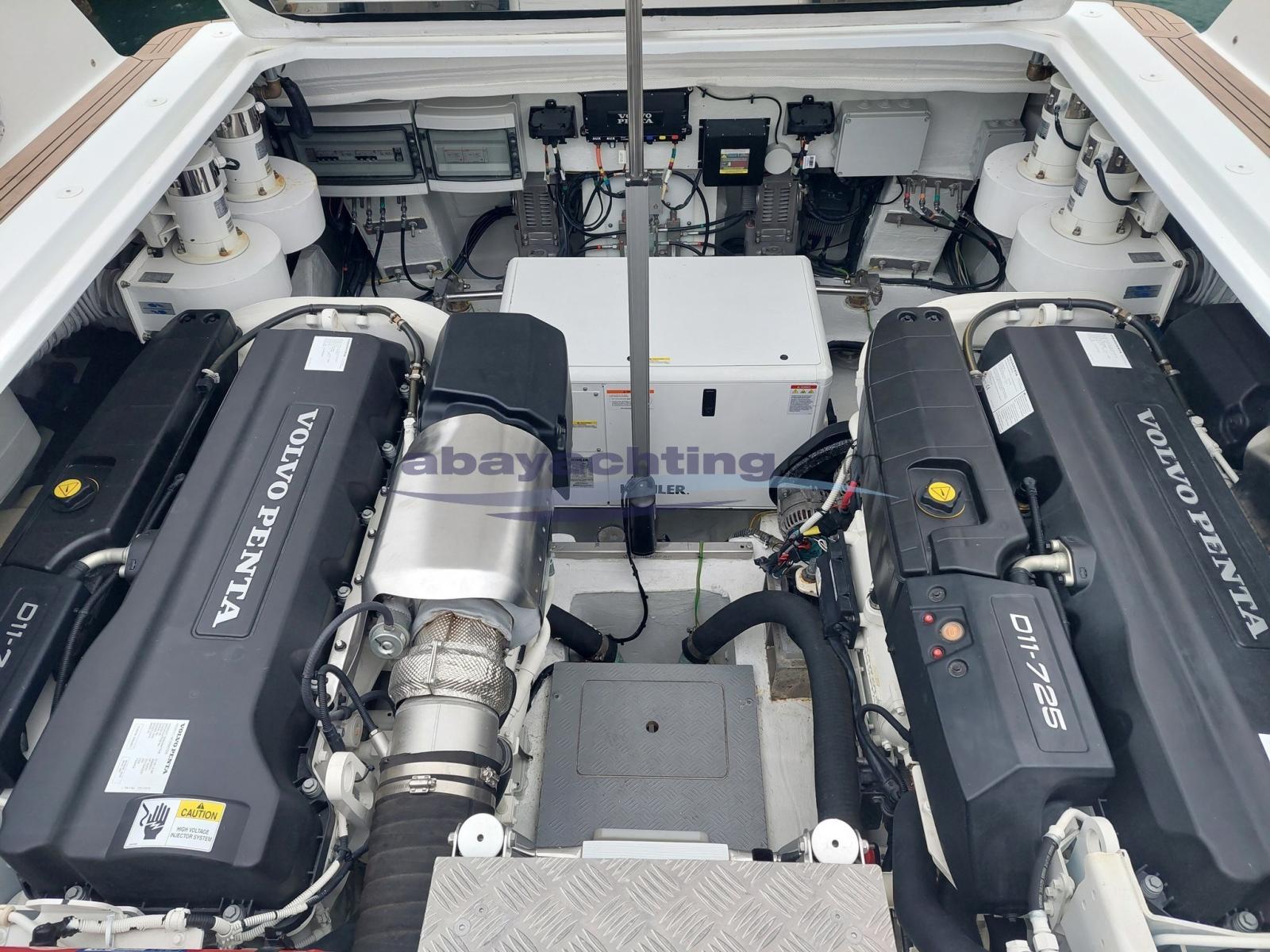 Van Dutch 48 with upgraded Volvo Penta D11 725hp in-line shaft motorisation with joystick control. Full optional: 8.5 kw generator, Side Power stern thruster + bow thruster, hydraulic stern platform with lift system, reversible air conditioning, foldable and electrically retractable bimini, double external refrigerator + ice-maker, Flexiteek synthetic teak deck, Garmin electronics with two 16" touch screens.