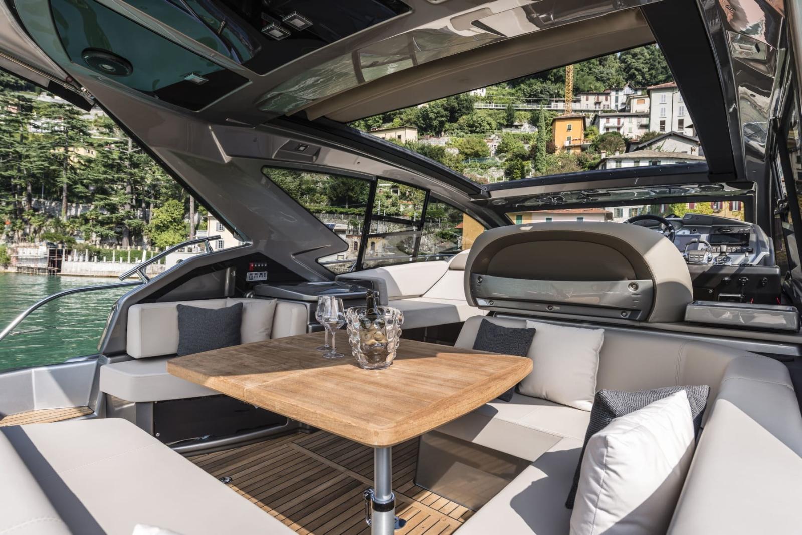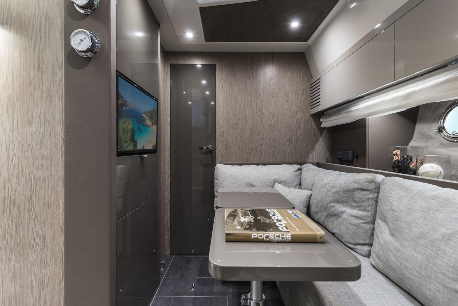 open in the bow, bluetooth/usb radio in the saloon with cockpit controls, 6 audio speakers + subwoofer,,