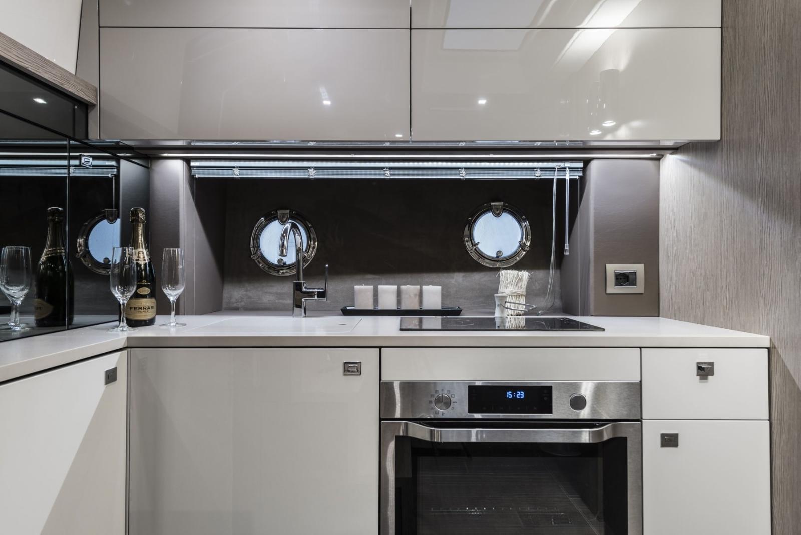 on the right, combined oven with microwave, 130lt cabin refrigerator with freezer, fiberglass hard top with