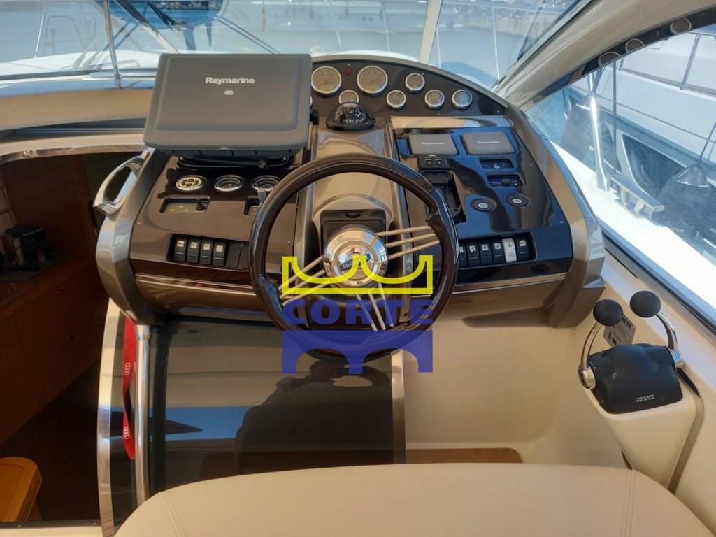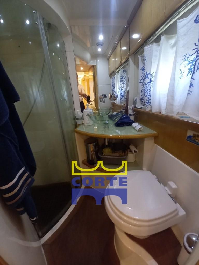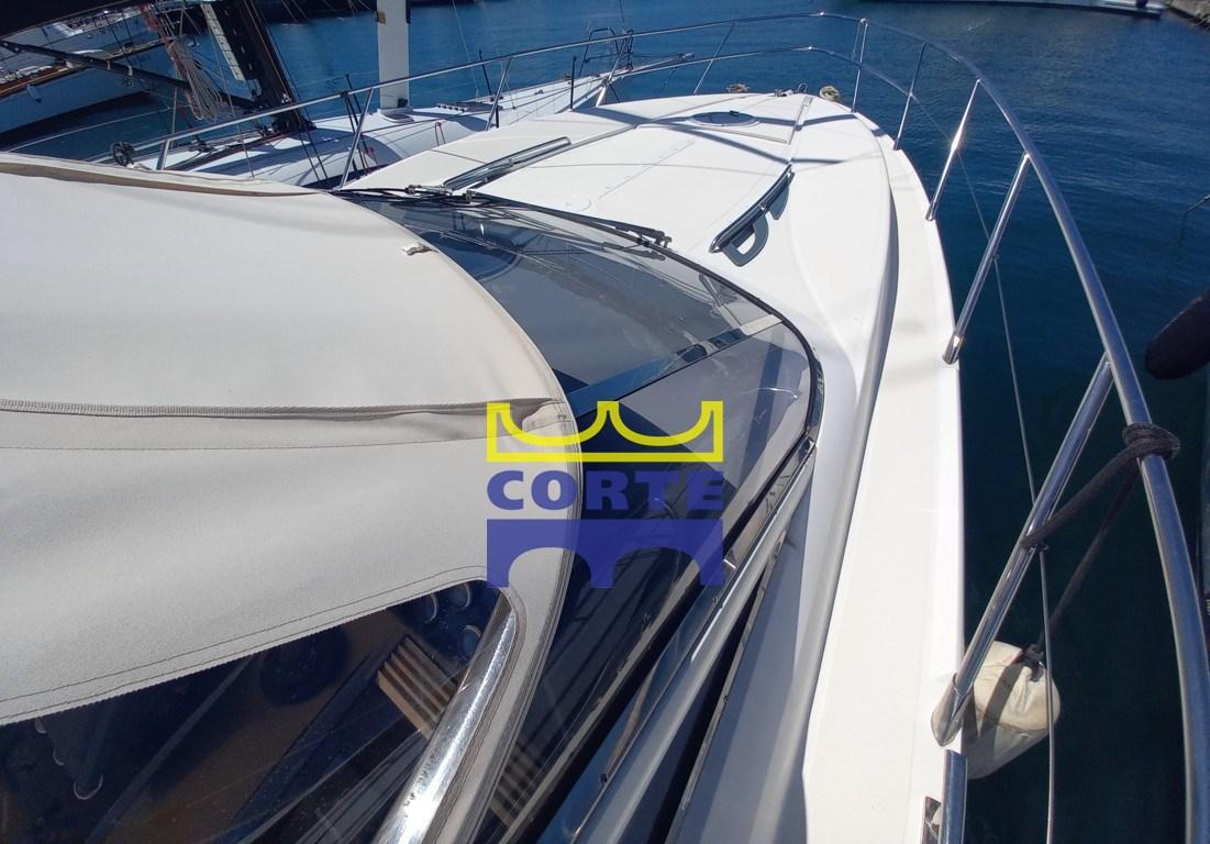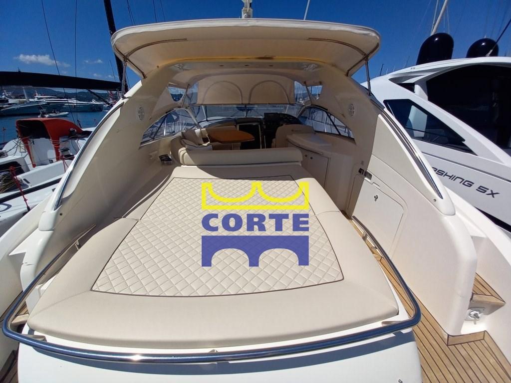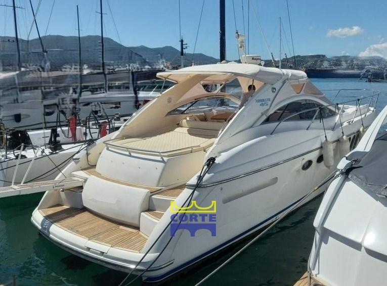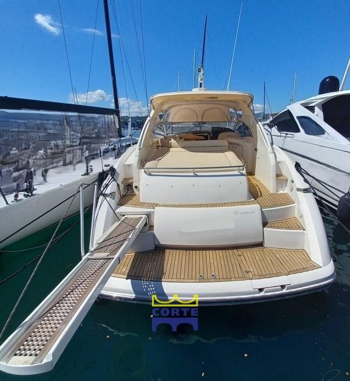 White hull, tender garage, 2 double cabins, aft and bow sundeck.