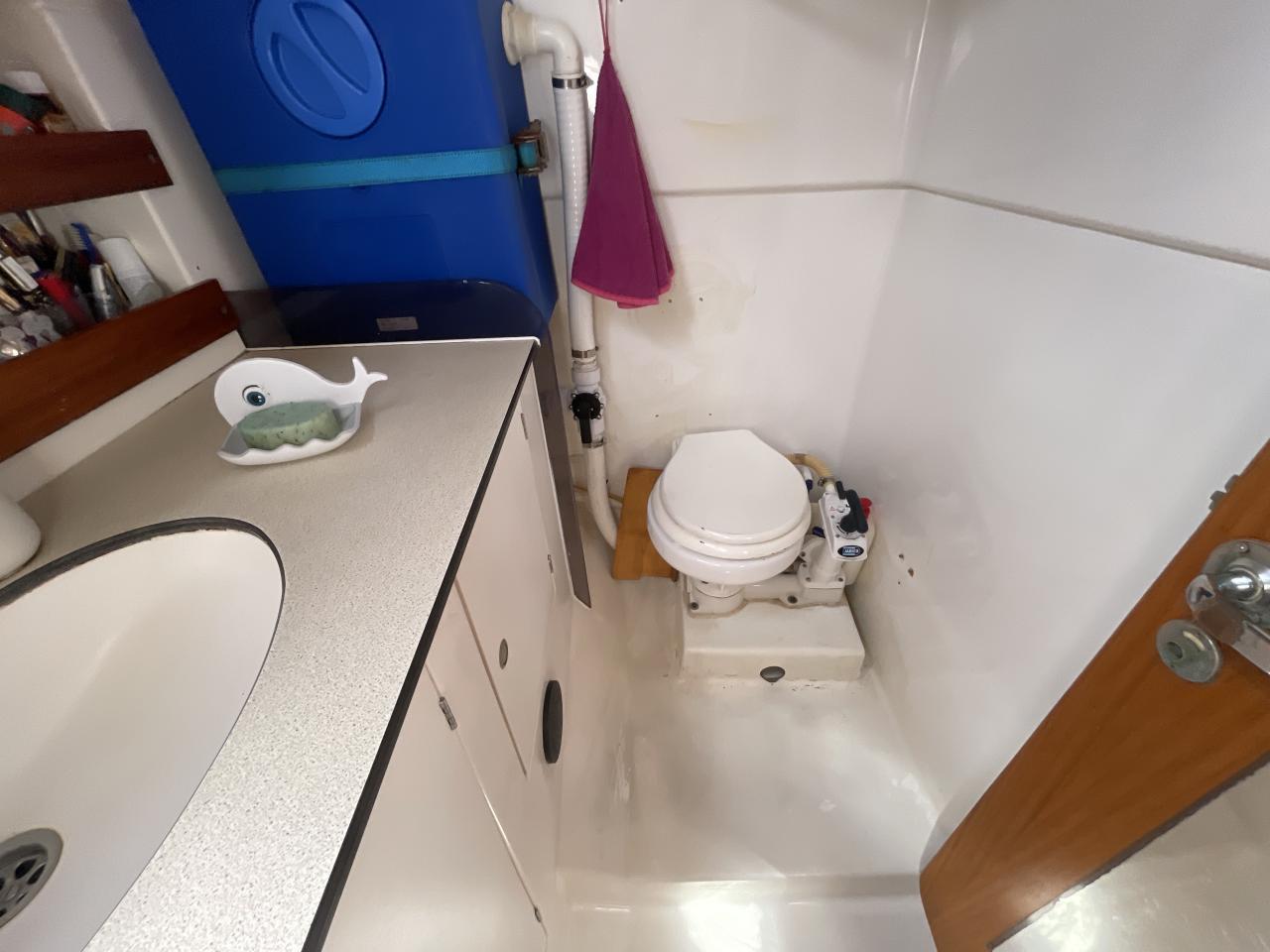 Shower room on the starboard stern, WC with black water tank, sink and shower tray