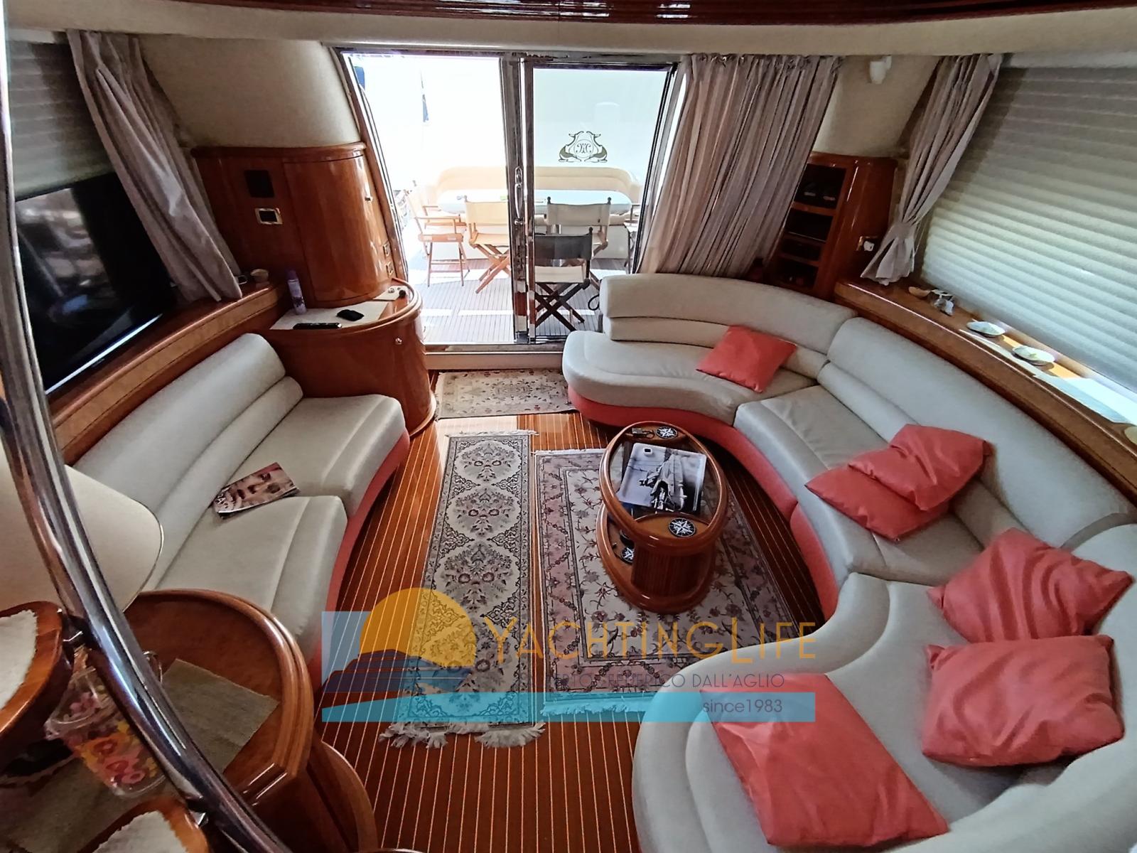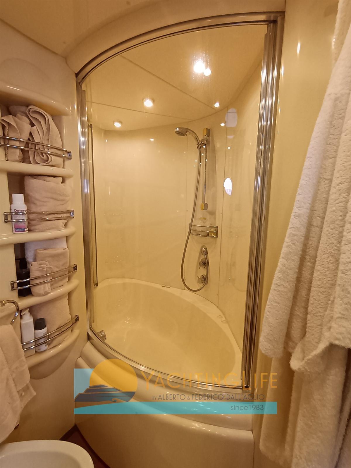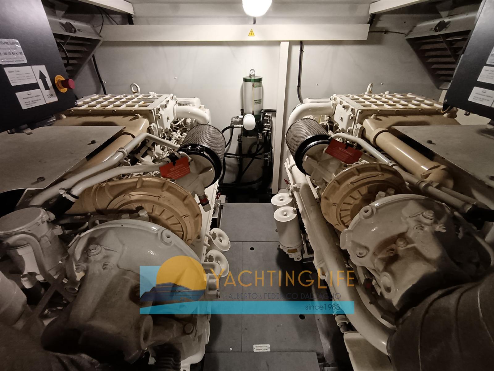 Engine Alarm, Bilge Alarm, Water pressure pump, Teak Side Decks, 2 Battery charger, Deck Shower, Twin Steering, Directional Spotlight, Hydraulic Flaps, Davits for tender on fly, Fire Extinguishing System, Flaps Indicators, Courtesy Lights, Gangway (idraulica), Platform, Automatic Bilge Pump, Entry door, Side door, Teak Cockpit, Shorepower connector, Electric Windlass, swimming ladder, Saddles for tender, cockpit table, Tender (e motore), Horn, 2 Stern Winches.
