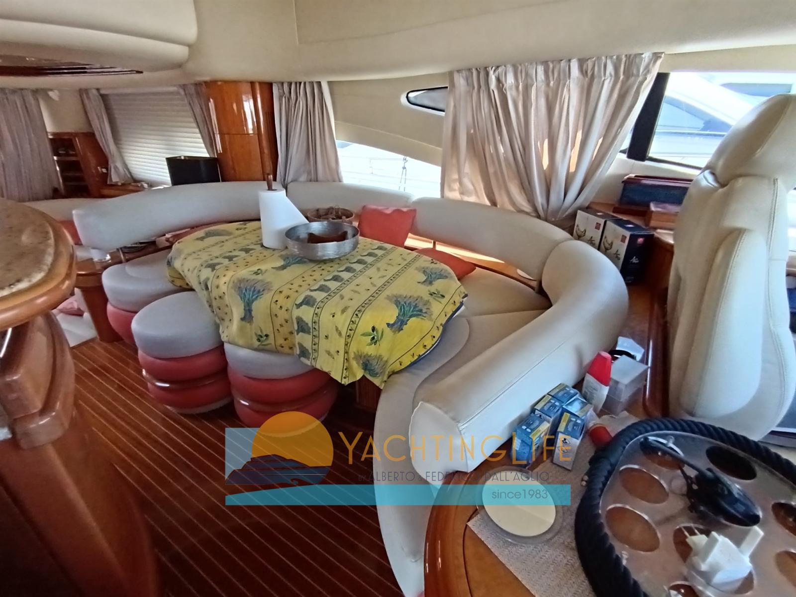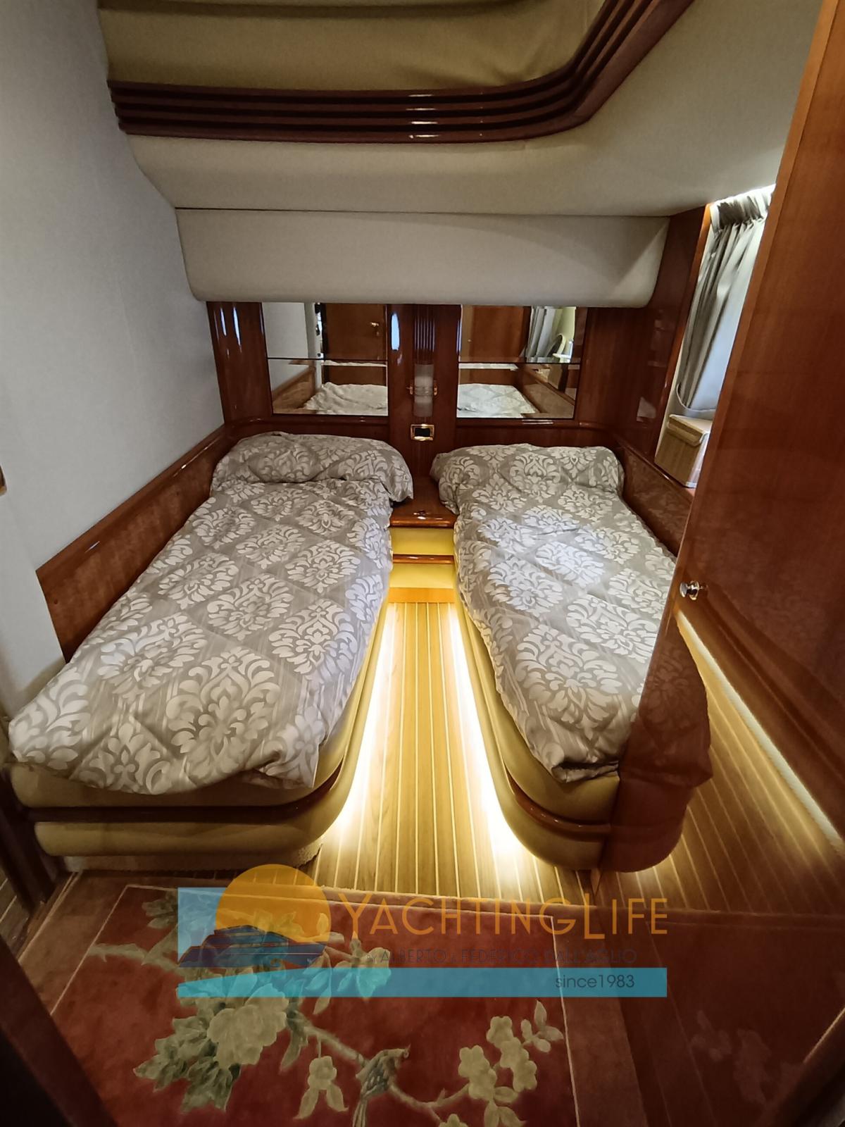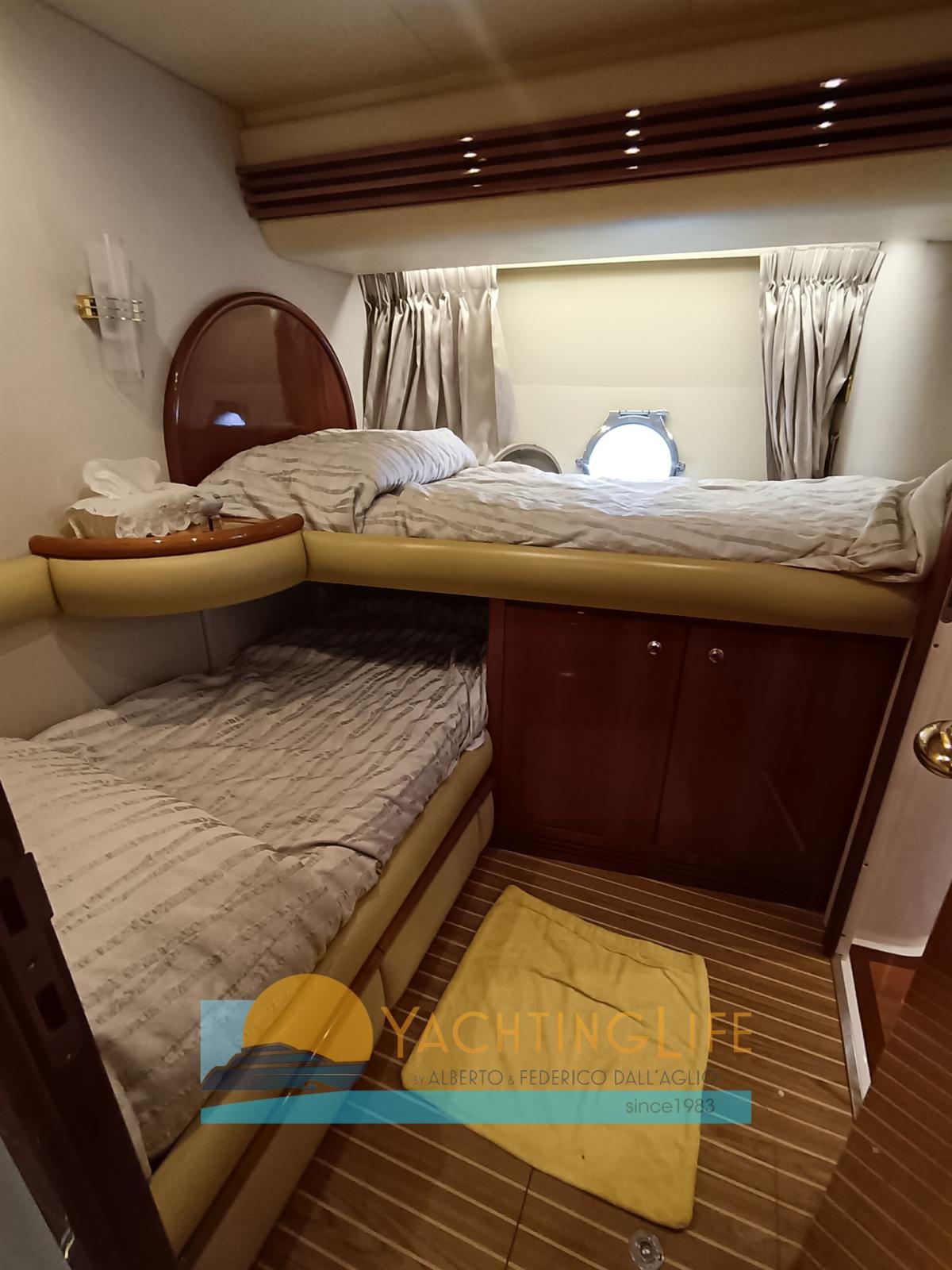 Engine Alarm, Bilge Alarm, Water pressure pump, Teak Side Decks, 2 Battery charger, Deck Shower, Twin Steering, Directional Spotlight, Hydraulic Flaps, Davits for tender on fly, Fire Extinguishing System, Flaps Indicators, Courtesy Lights, Gangway (idraulica), Platform, Automatic Bilge Pump, Entry door, Side door, Teak Cockpit, Shorepower connector, Electric Windlass, swimming ladder, Saddles for tender, cockpit table, Tender (e motore), Horn, 2 Stern Winches.