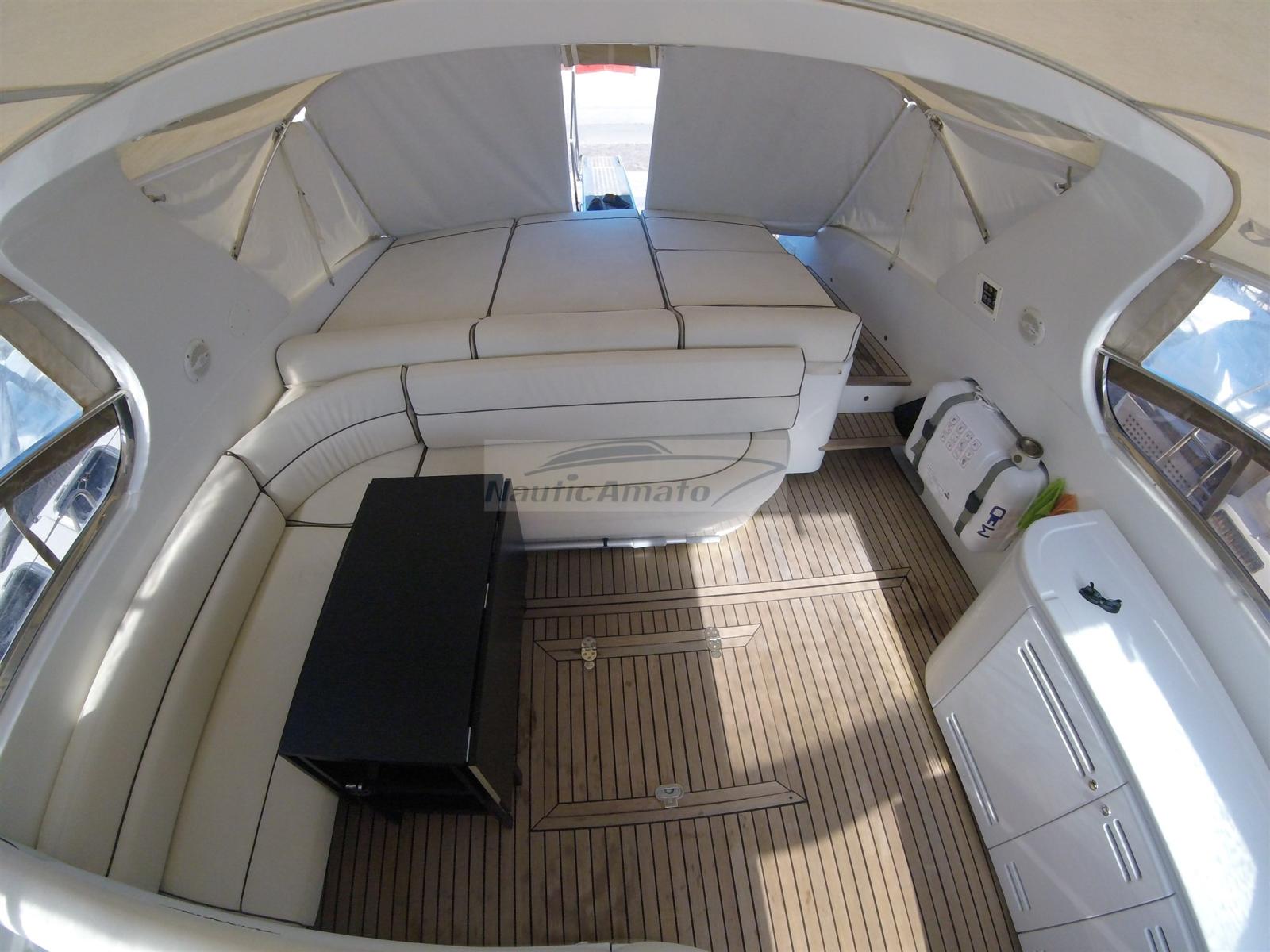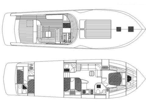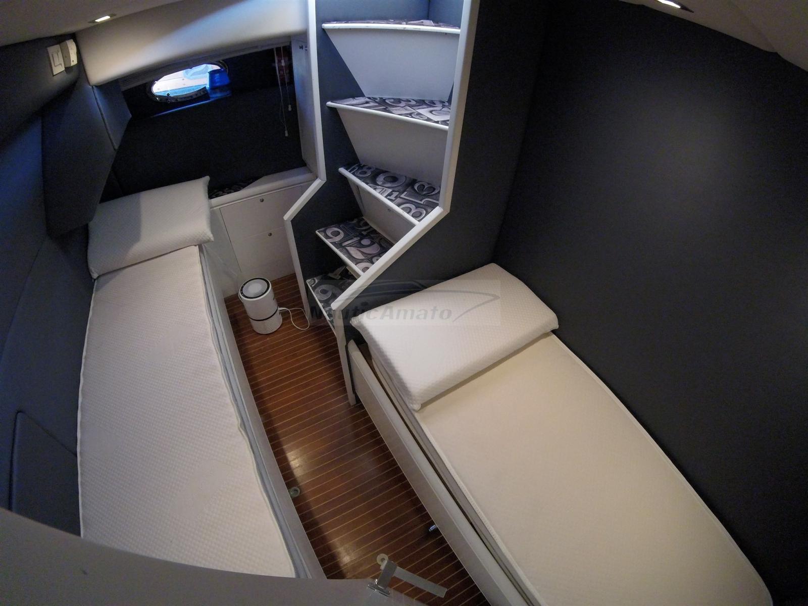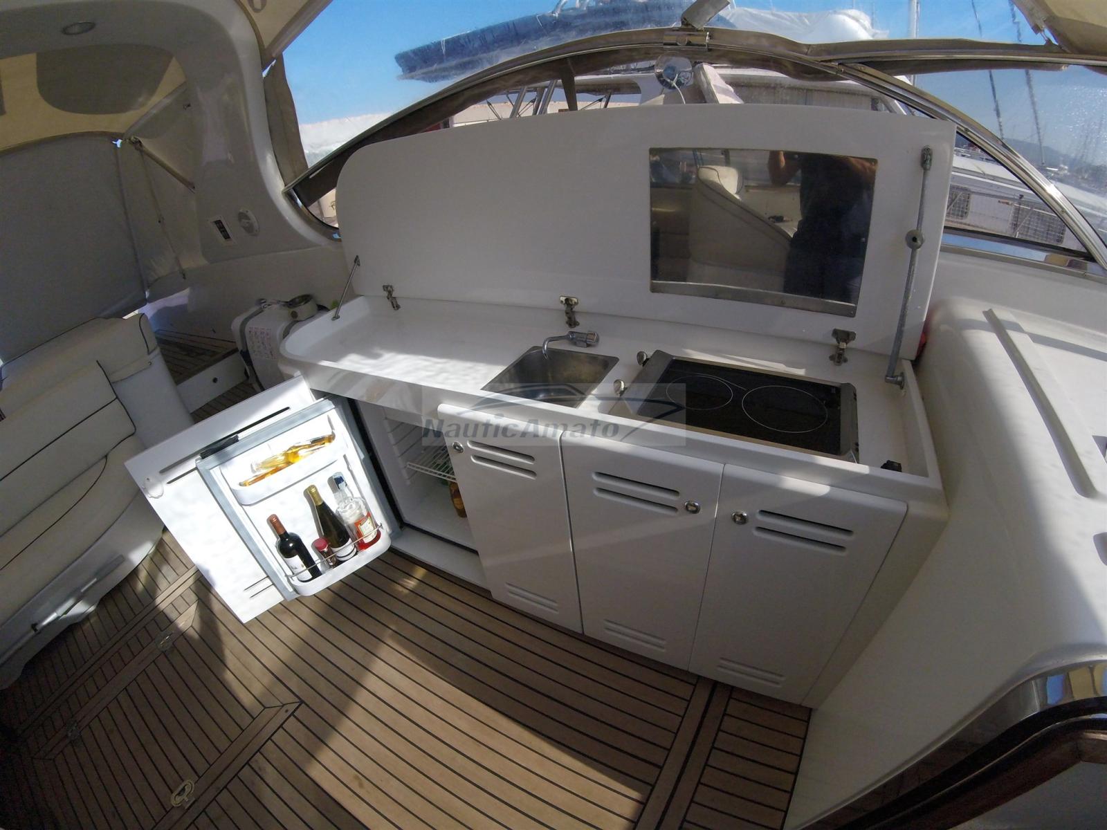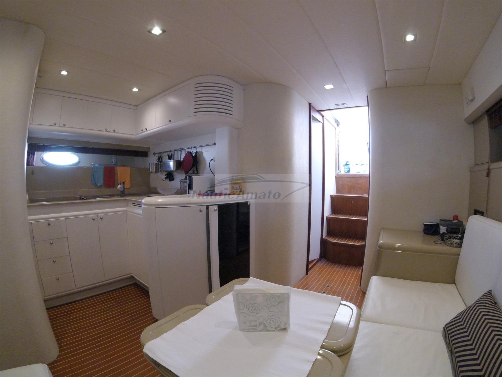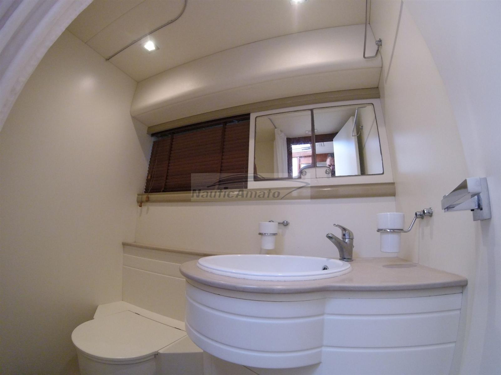 Engine Alarm, Bilge Alarm, Water pressure pump, Shore power cable, Deck Shower, Directional Spotlight, Hydraulic Flaps, Fire Extinguishing System, Flaps Indicators, Washbasin in the cockpit, Courtesy Lights, Underwater lights, Gangway (Idraulica), Teak Cockpit, Shorepower connector, Electric Windlass, swimming ladder, cockpit table, Living Room Foldable Table.