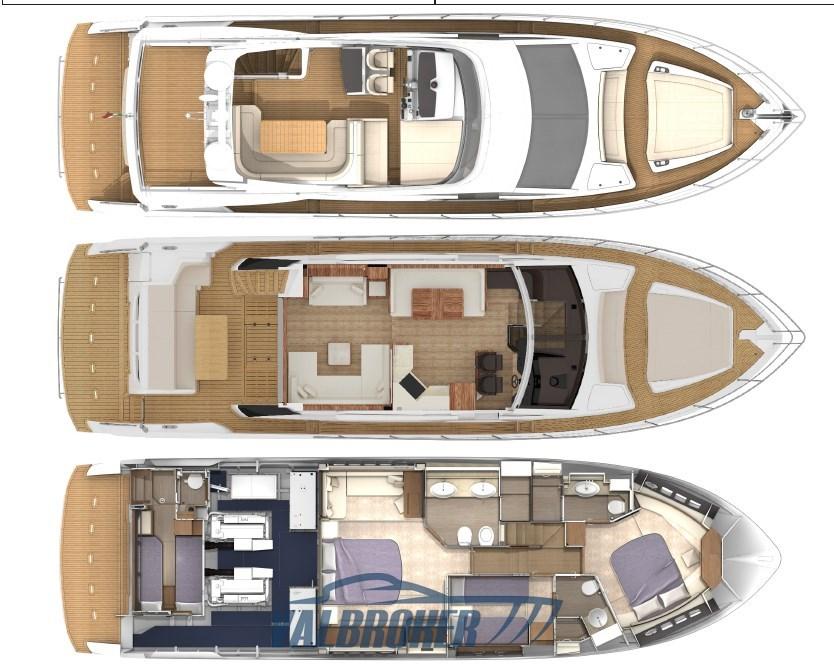 Luxury yacht with three dedicated sunbathing areas: one in the bow, with a sun lounger and reclining armchairs and two on the flybridge, which offer a splendid balcony overlooking the sea. Three double cabins with ensuite facilities and crew cabin with ensuite.