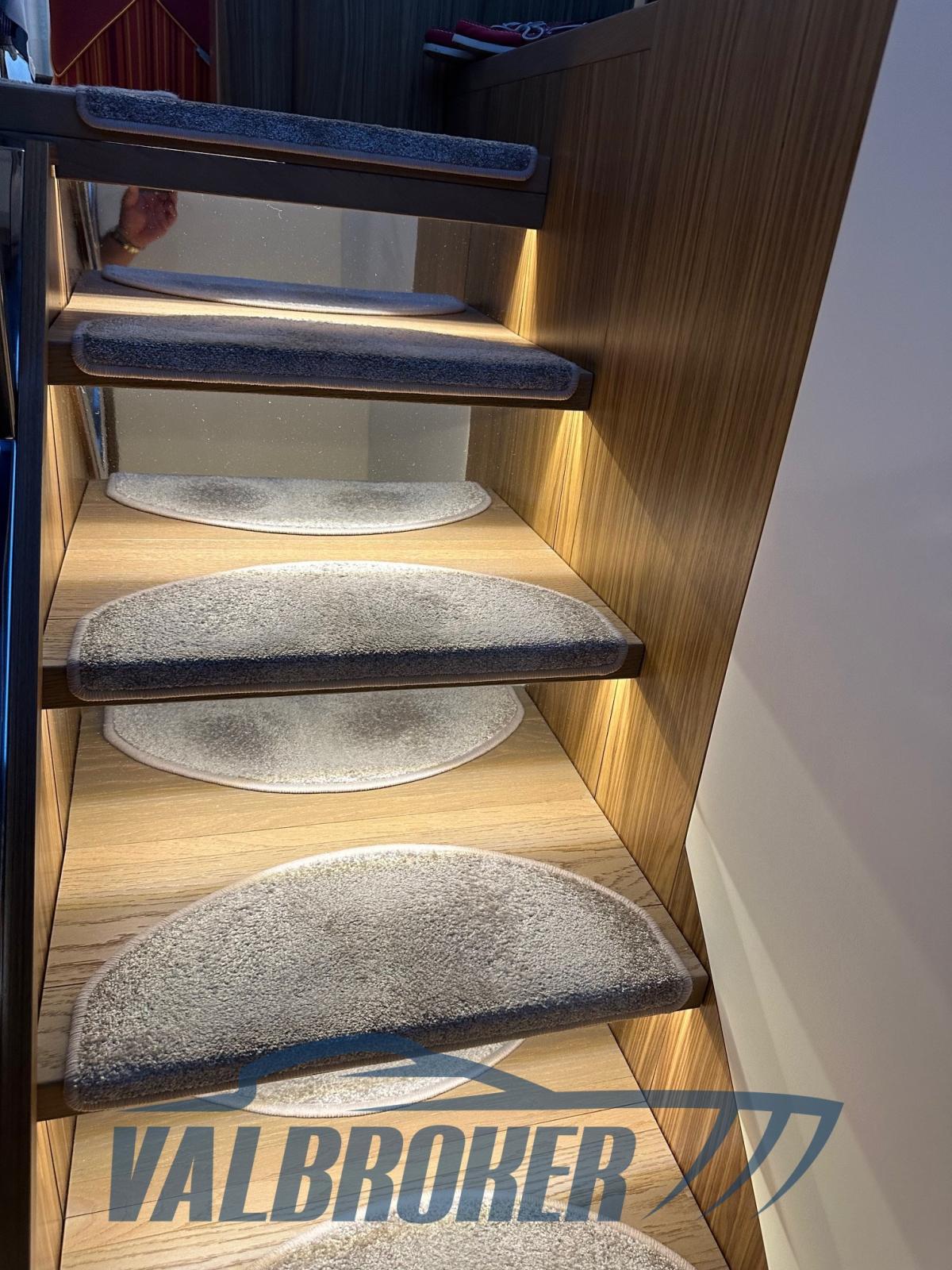 Anchor (inox 45kg), Water pressure pump, Deck Shower, Bow Thruster (side power), Directional Spotlight (con comando a distanza), Hydraulic Flaps, Hard top (soft top in vetroresina), Flaps Indicators, Courtesy Lights, Underwater lights, Solar panels (con Victron), Gangway (elettroidraulica a scomparsa), Platform (idraulica, teak), Side door, Teak Cockpit, Shorepower connector, Water harbor connector system, Electric Windlass, swimming ladder, Stabilizers (Seakeeper 9 2019), cockpit table, Stern Winches.