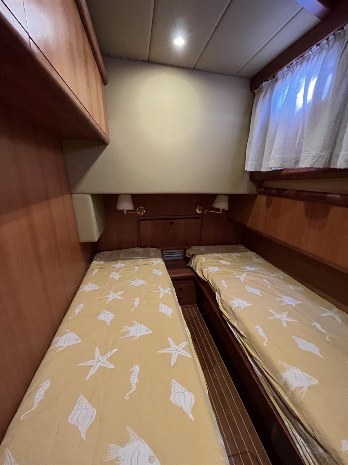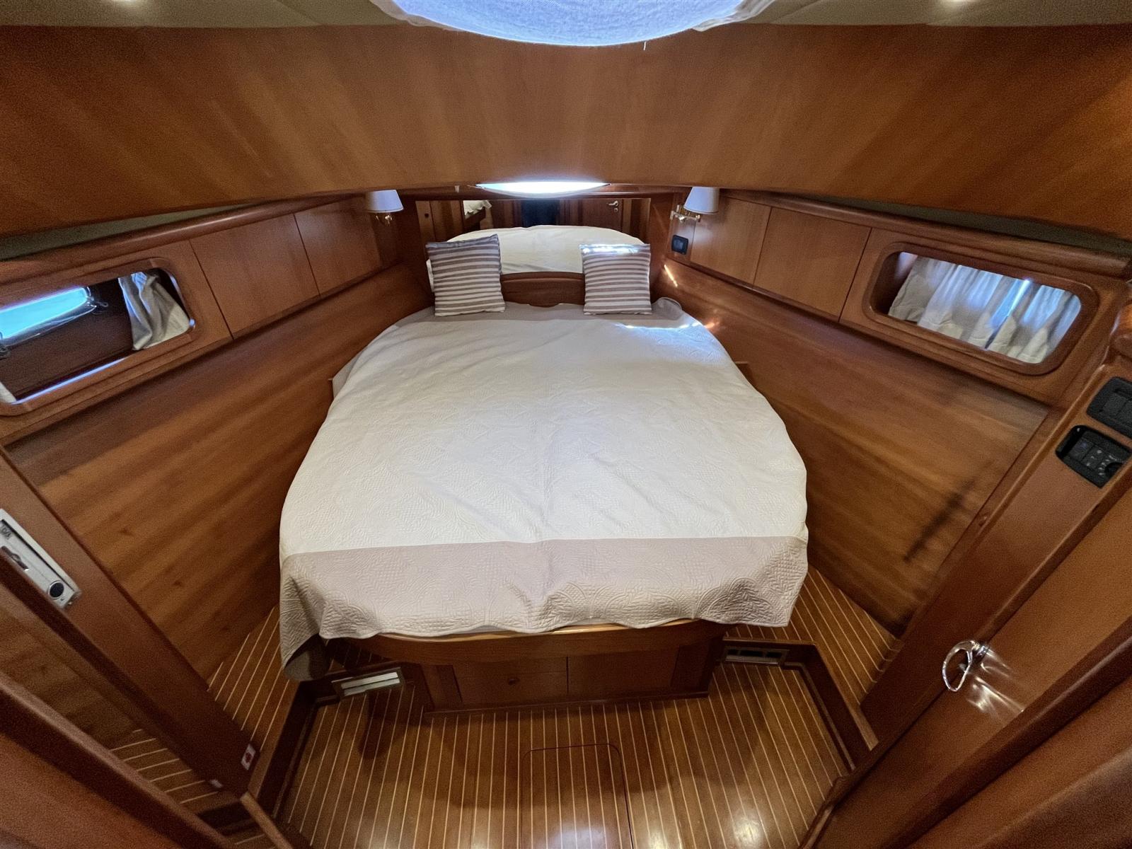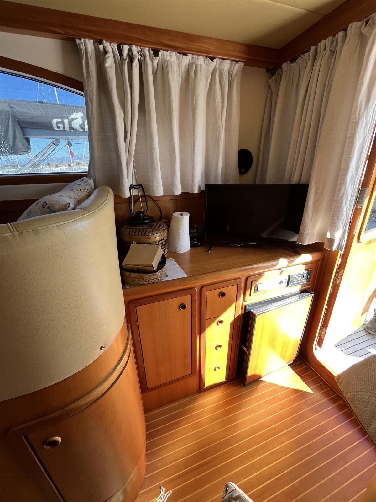 2025: sealing of hydraulic axles, bushings, propeller balancing, total closure of the shading nets, saloon ceilings, engine compartment soundproofing, exhaust raiser and resining, teak regumming, cockpit cabinet painting and fly table and all external wooden parts.